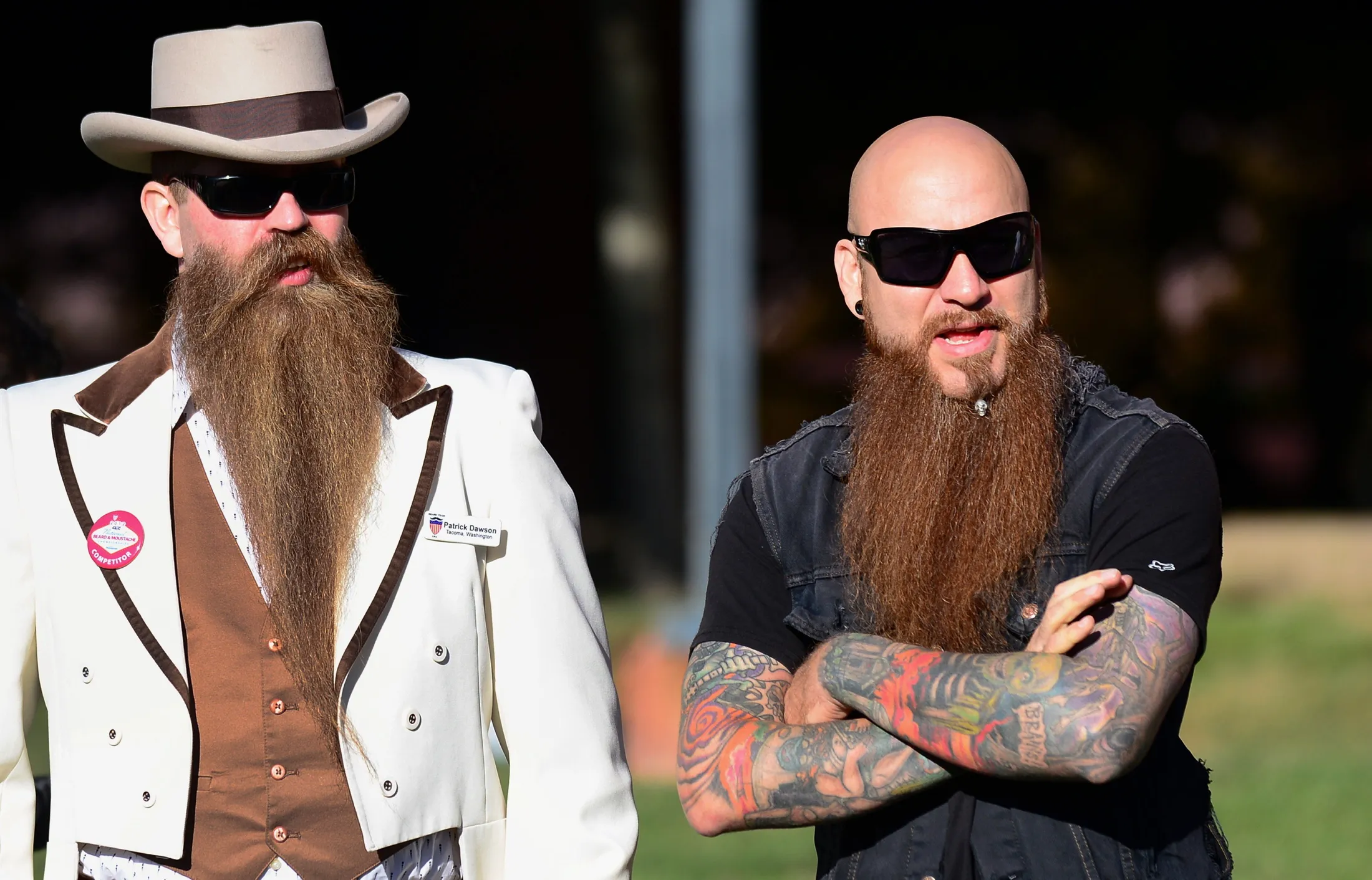 Patrick Dawson (L) from Tacoma, Washington, stands beside a friend while watching the competition at the third annual National Beard and Moustache Championships in Las Vegas, Nevada on November 11, 2012. (Photo by Frederic J. Brown/AFP Photo)