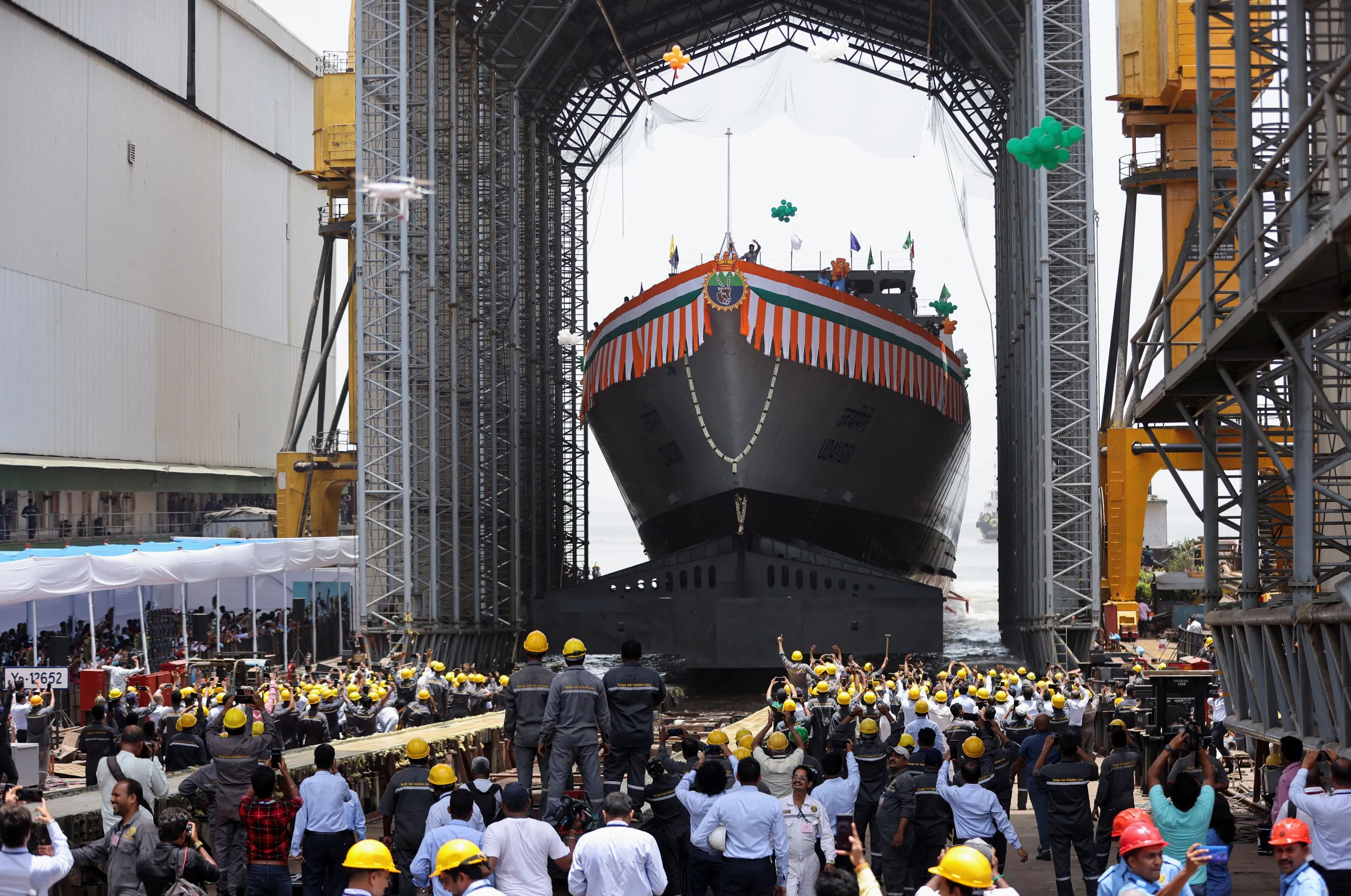 Workers wave during the launch of the second advanced stealth frigate warship under Project 17A named Udaygiri at the Mazagon Dock Shipbuilders Limited (MDL), in Mumbai, India, May 17, 2022. (Photo by Francis Mascarenhas/Reuters)