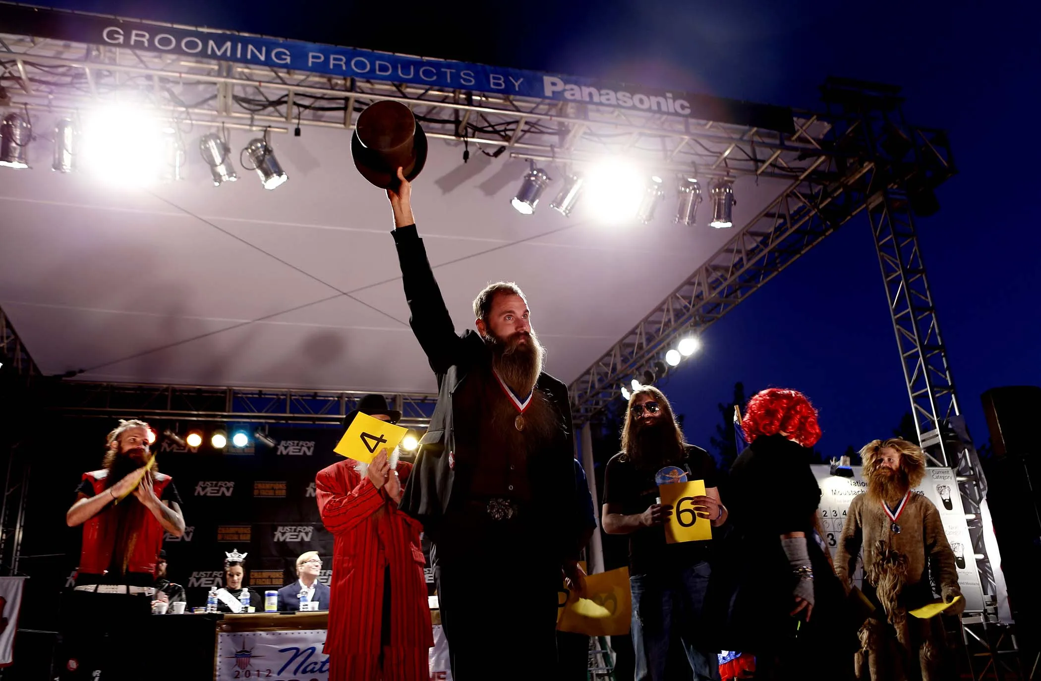Neil Mohernan reacts as he wins the full beard natural category during the 2012 National Beard and Moustache Championship in Las Vegas. (Photo by Isaac Brekken/Invision for Panasonic)