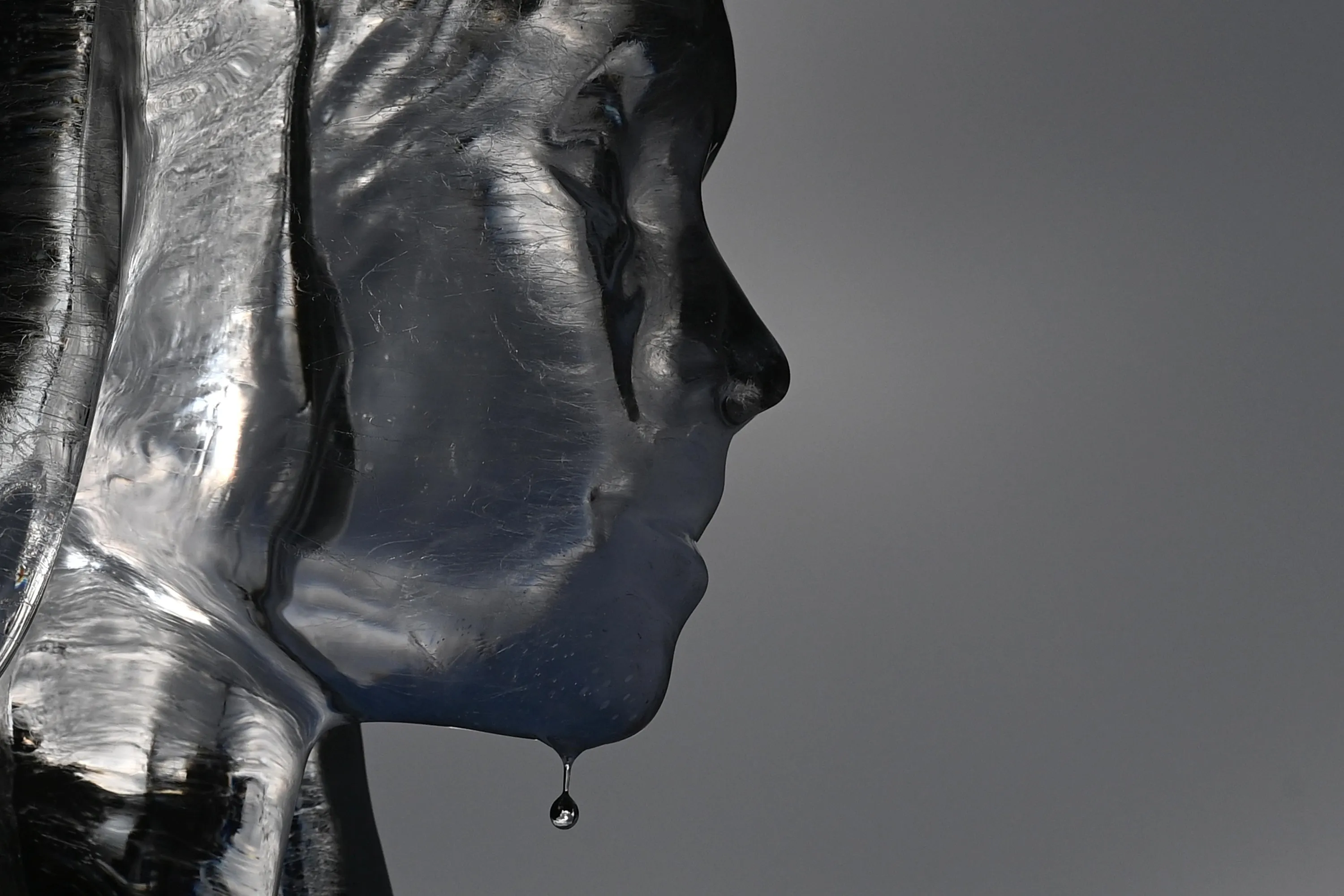 Water falls off an ice sculpture depicting a woman walking to collect water, as environmental and public health campaign group WaterAid highlights the threat posed globally by climate change to healthy water supplies, in London, Britain, September 15, 2021. (Photo by Toby Melville/Reuters)