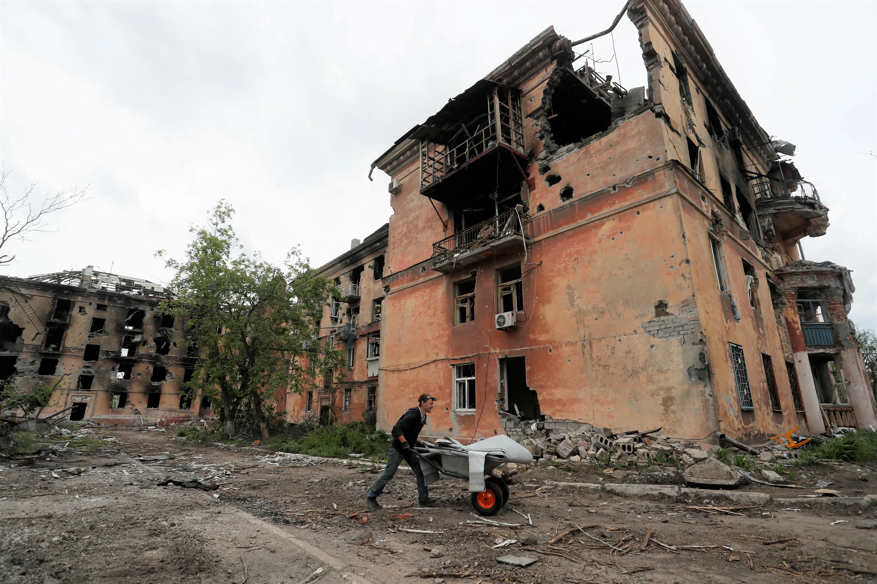A local resident pushes a wheelbarrow past a heavily damaged apartment building near Azovstal Iron and Steel Works, during Ukraine-Russia conflict in the southern port city of Mariupol, Ukraine on May 22, 2022. (Photo by Alexander Ermochenko/Reuters)