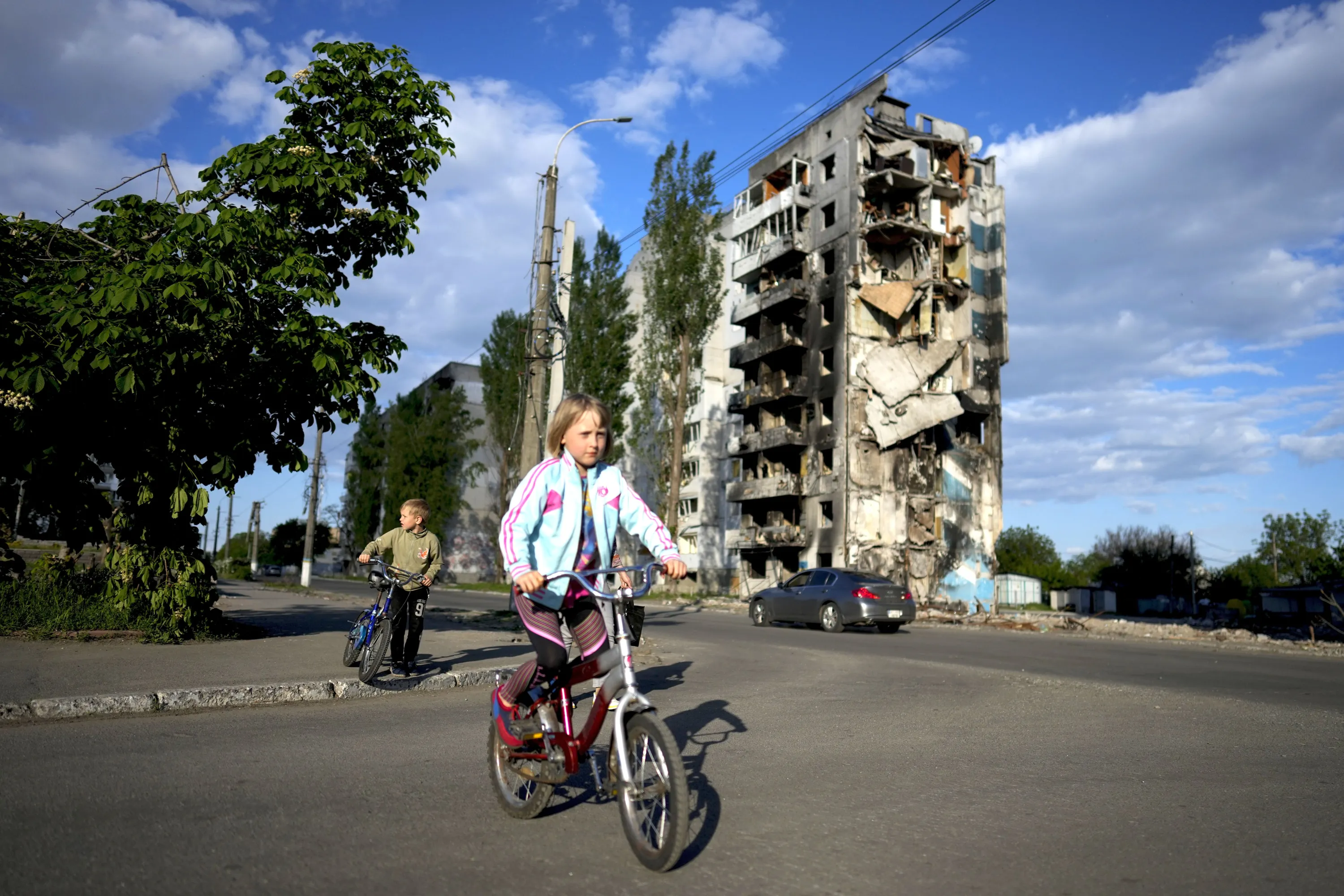 A girl rides a bicycle in front of houses ruined by shelling in Borodyanka, Ukraine, Tuesday, May 24, 2022. (Photo by Natacha Pisarenko/AP Photo)