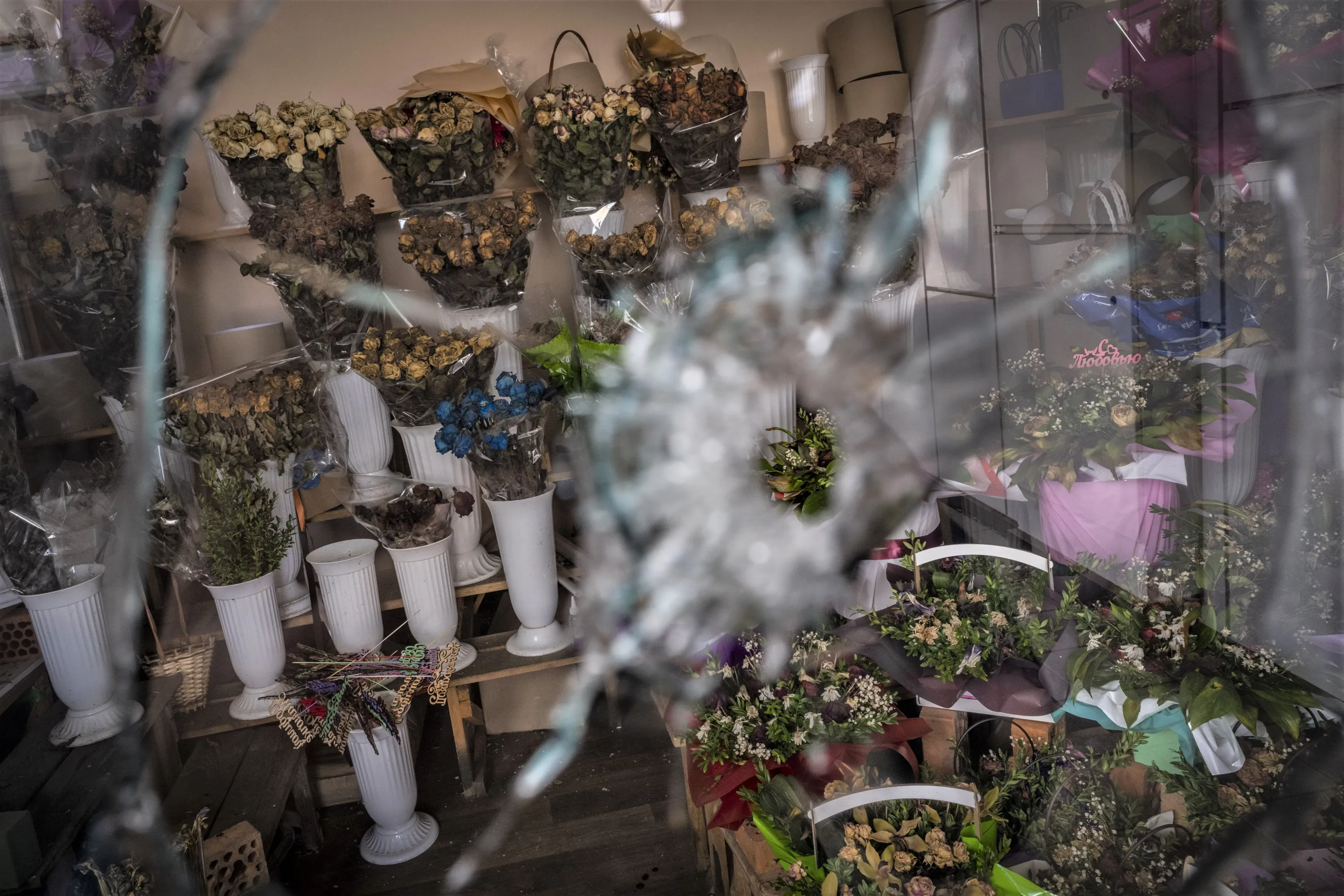 Dried flower bouquets inside a flower shop in a temporary closed market Kharkiv, eastern Ukraine, Tuesday, May 24, 2022. (Photo by Bernat Armangue/AP Photo)