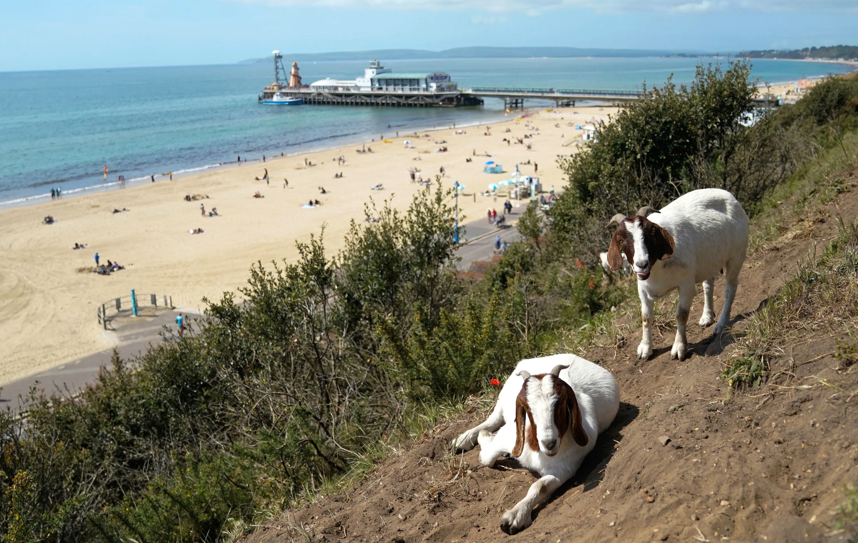 Goats on the cliff top over looking Bournemouth Beach in Dorset on Saturday, May 14, 2022. Temperatures are warming up for the weekend as most of Britain can expect to be bathed in sunshine. (Photo by Andrew Matthews/PA Images via Getty Images)