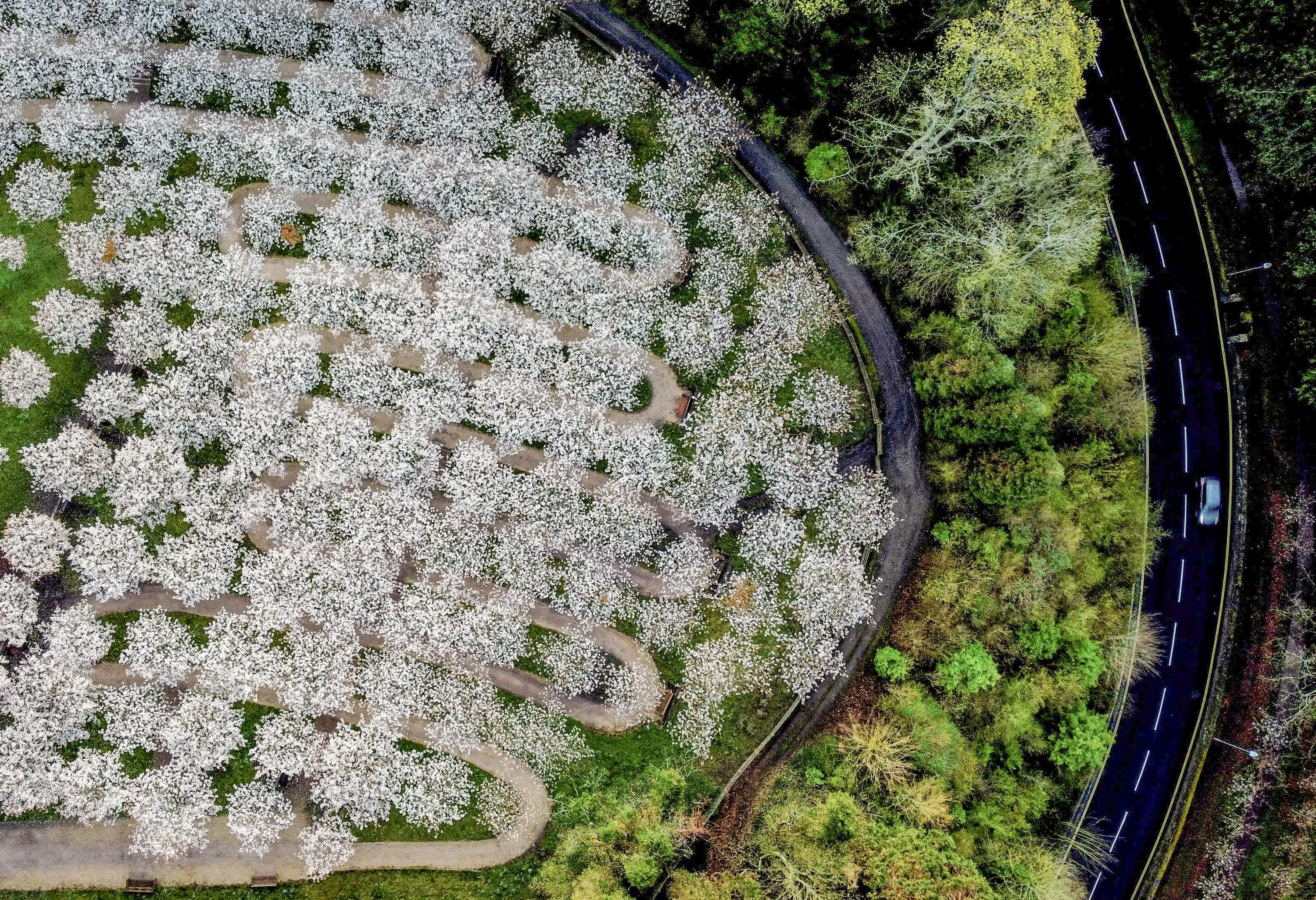 A car passes outside the Cherry Orchard at Alnwick Gardens, which has the largest collection of Taihaku trees, in Alnwick, Northumberland, Britain April 18, 2022. Picture taken with a drone. (Photo by Lee Smith/Reuters)