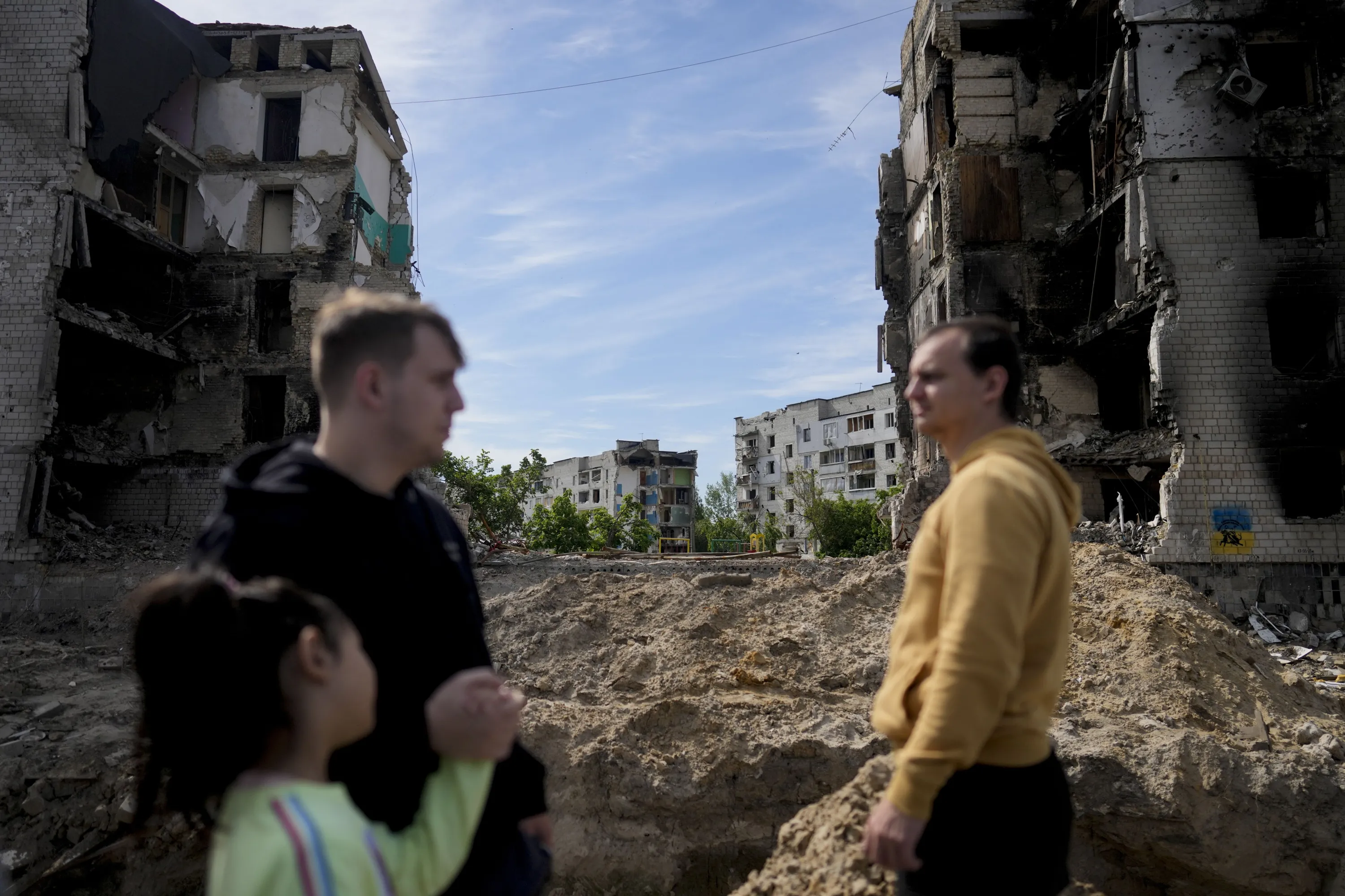 People stand in front of a building damaged by shelling in Borodyanka, on the outskirts of Kyiv, Ukraine, Wednesday, May 25, 2022. (Photo by Natacha Pisarenko/AP Photo)