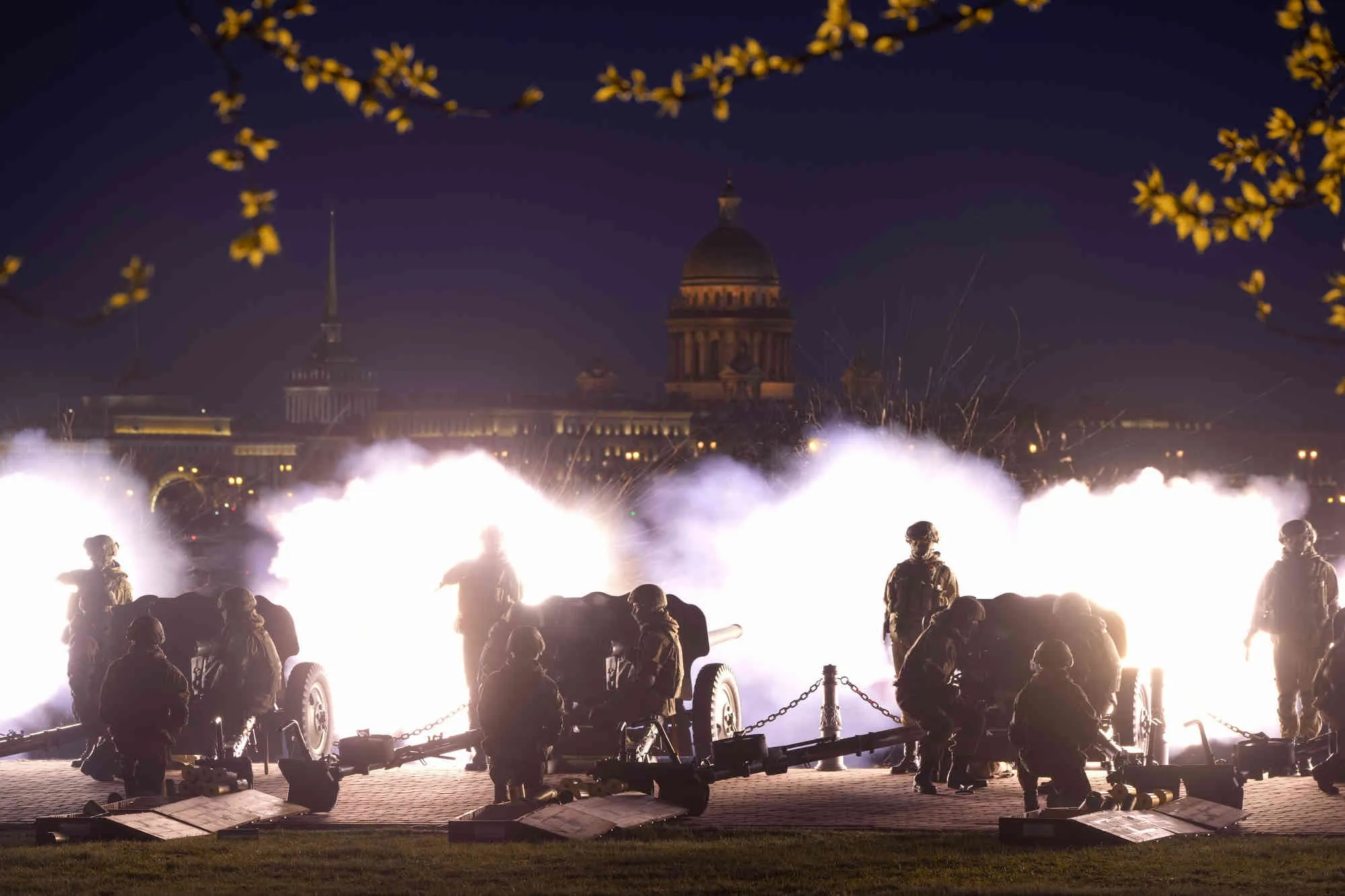 Guns fire a salute during Victory Day, the 77th anniversary of the end of World War II in Europe in St. Petersburg, Russia, Monday, May 9, 2022. (Photo by Dmitri Lovetsky/AP Photo)