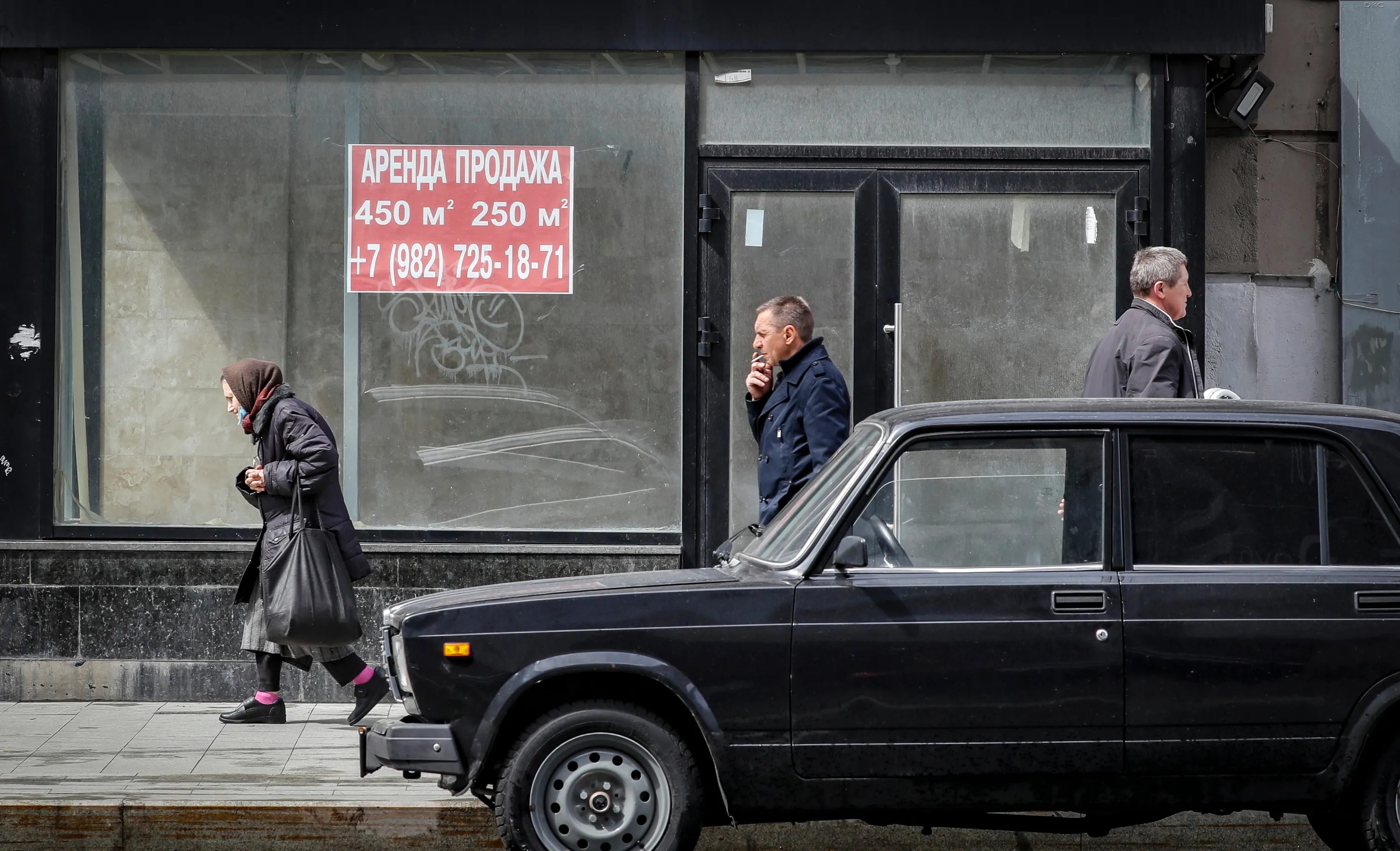 Russian people walk past the window of empty commercial premises in Moscow, Russia on May 19, 2022. As the result of sanctions imposed by the West on Russia, a number of international brands have announced the suspension or limitation of their business in Russia. (Photo by Yuri Kochetkov/EPA/EFE)