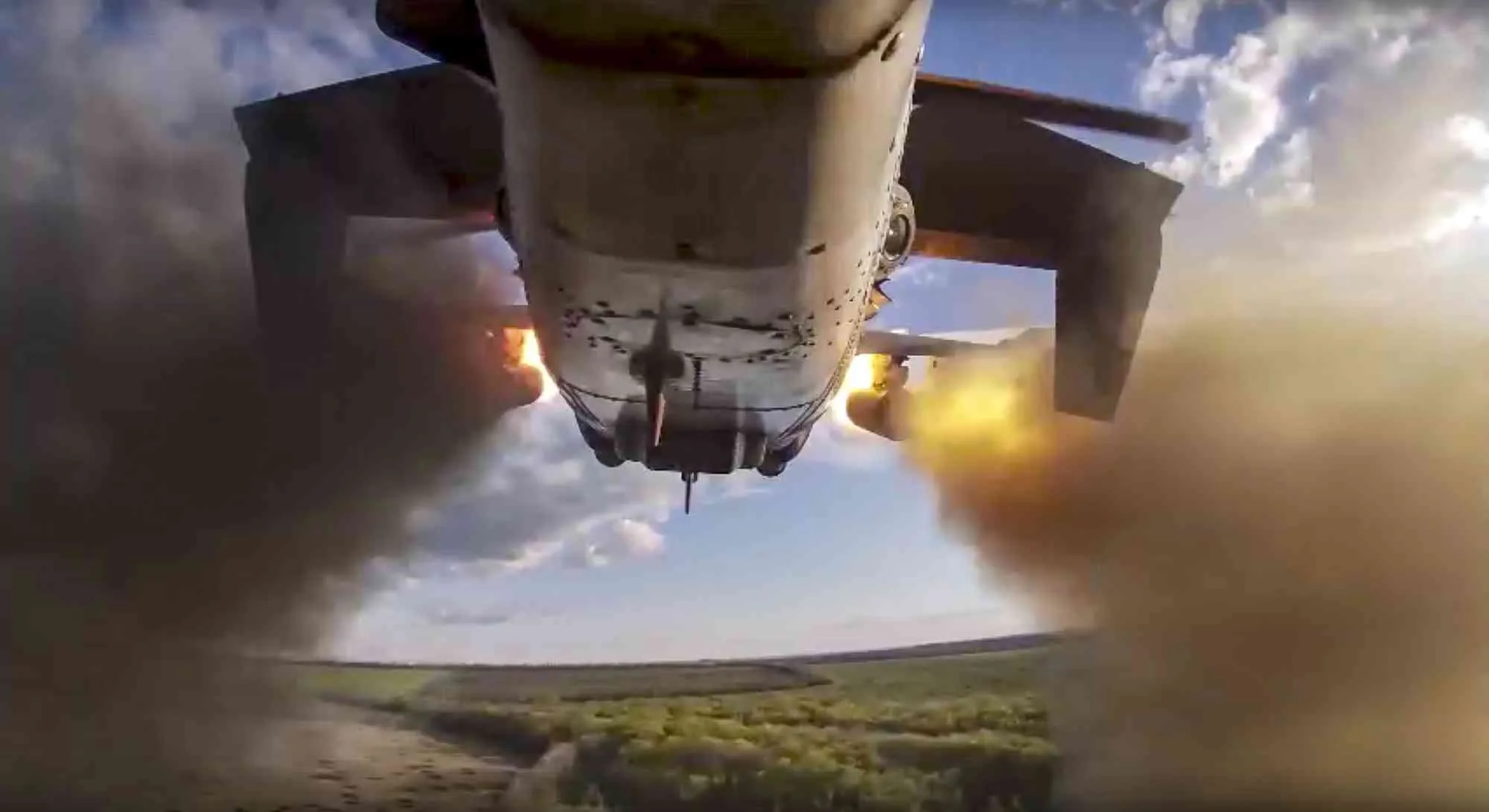 In this handout photo released by Russian Defense Ministry Press Service released on Wednesday, May 25, 2022, a Ka-52 helicopter gunship fires rockets on a mission at an undisclosed location in Ukraine. (Photo by Russian Defense Ministry Press Service via AP Photo)