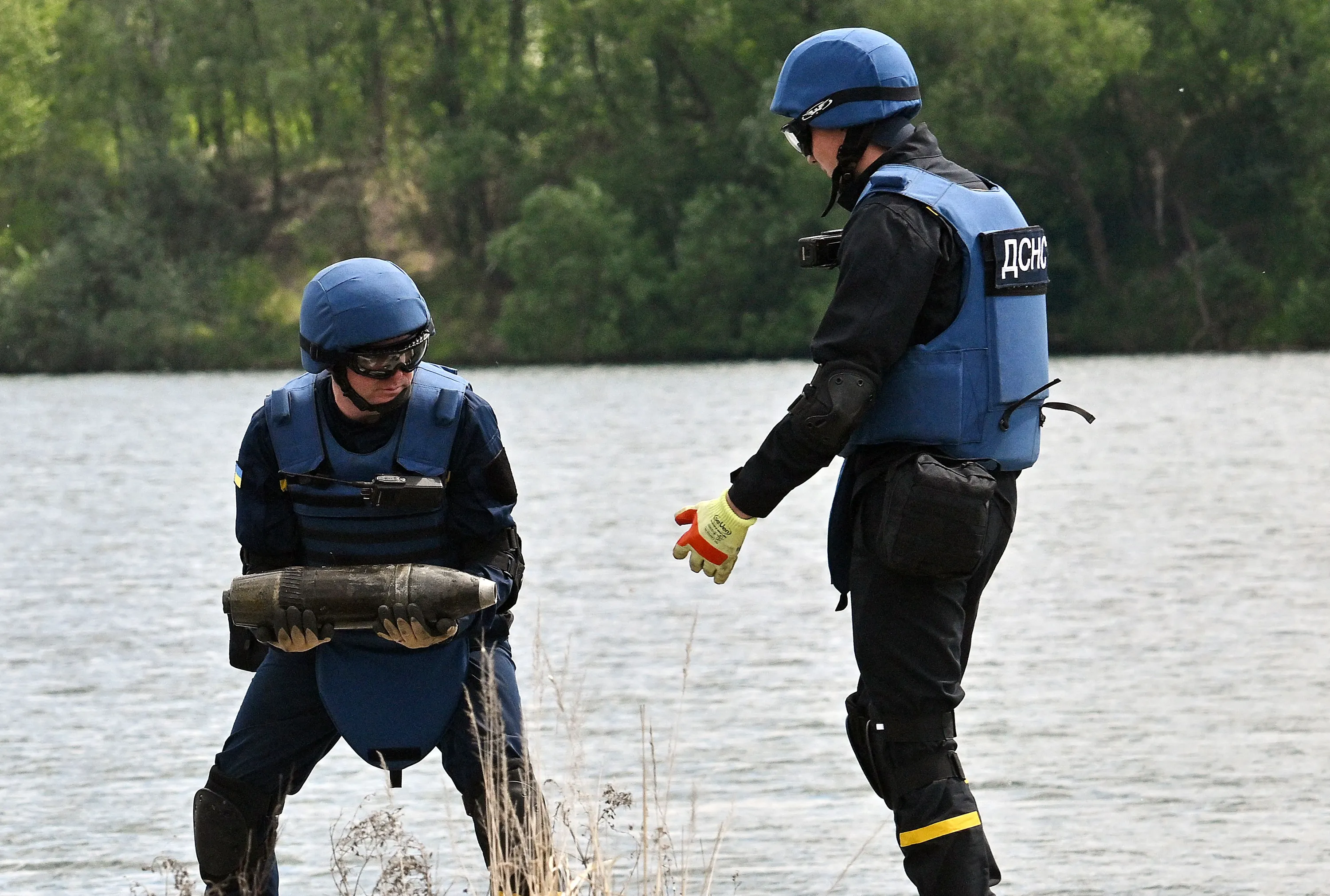 Ukrainian deminers collect unexploded material during demining works on Blue Lake in Horenka village, Kyiv region on May 27, 2022 due to the approaching bathing season. (Photo by Sergei Supinsky/AFP Photo)