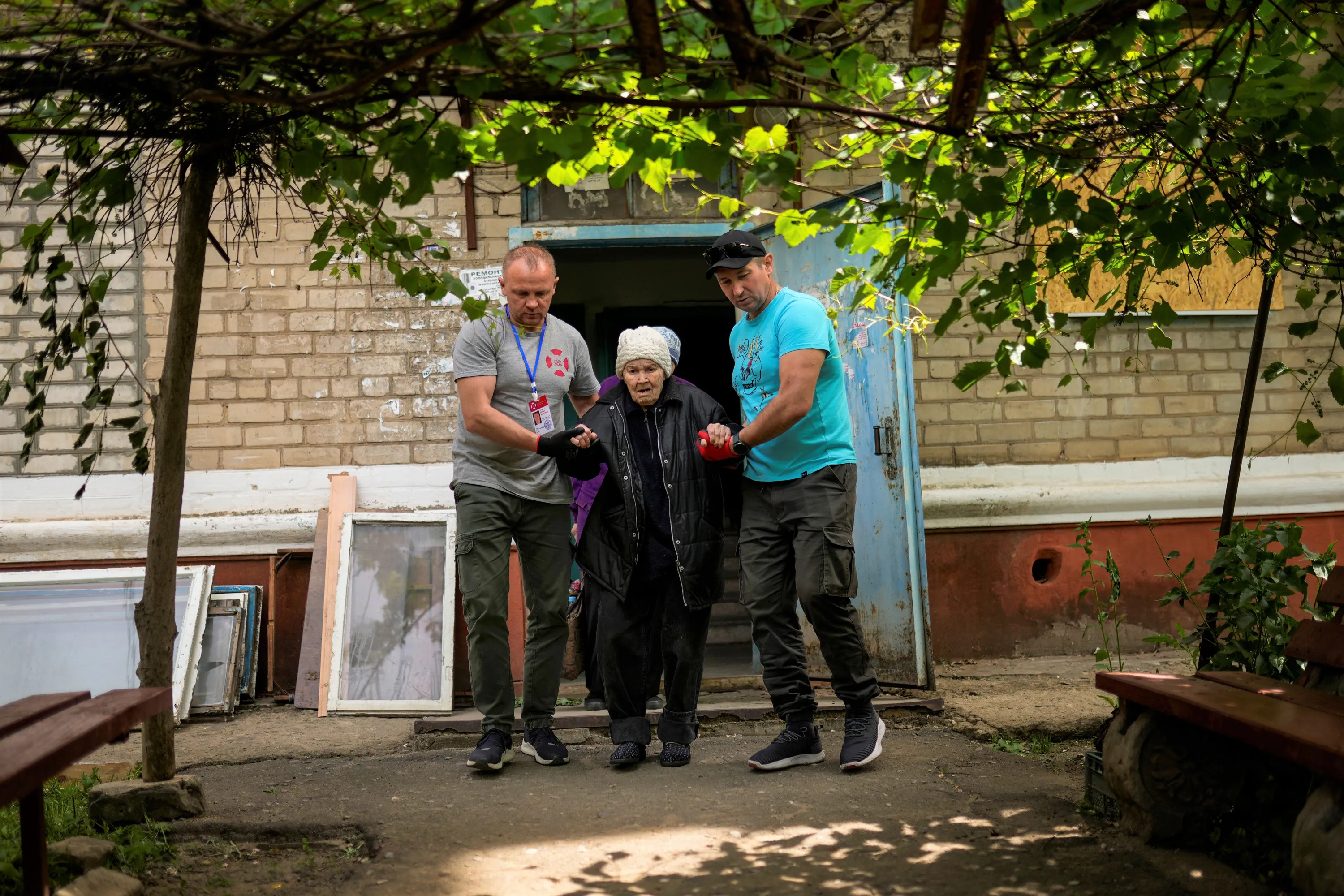 A woman is evacuated by volunteers of Vostok SOS charitable organisation in Kramatorsk, eastern Ukraine, Thursday, May 26, 2022. Residents in villages and towns near the front line continue to flee as fighting rages in eastern Ukraine. (Photo by Francisco Seco/AP Photo)