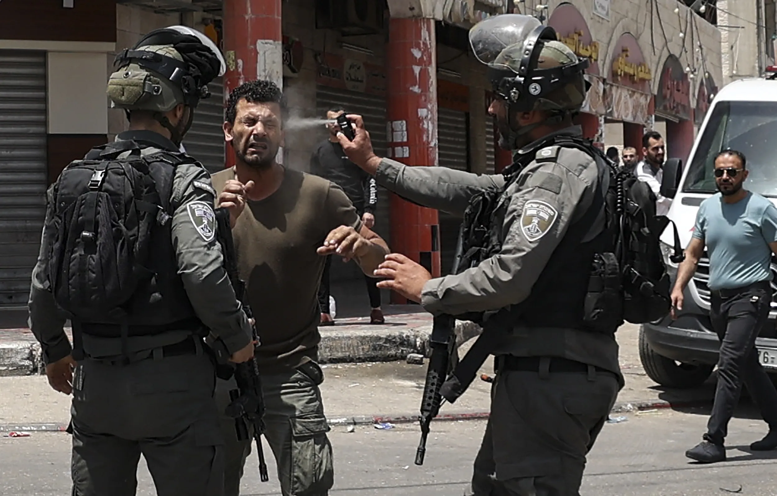 An Israeli border guard sprays pepper gas in the face of a Palestinian protester, during scuffles in the West Bank town of Hauwara, on May 27, 2022. (Photo by Jaafar Ashtiyeh/AFP Photo)