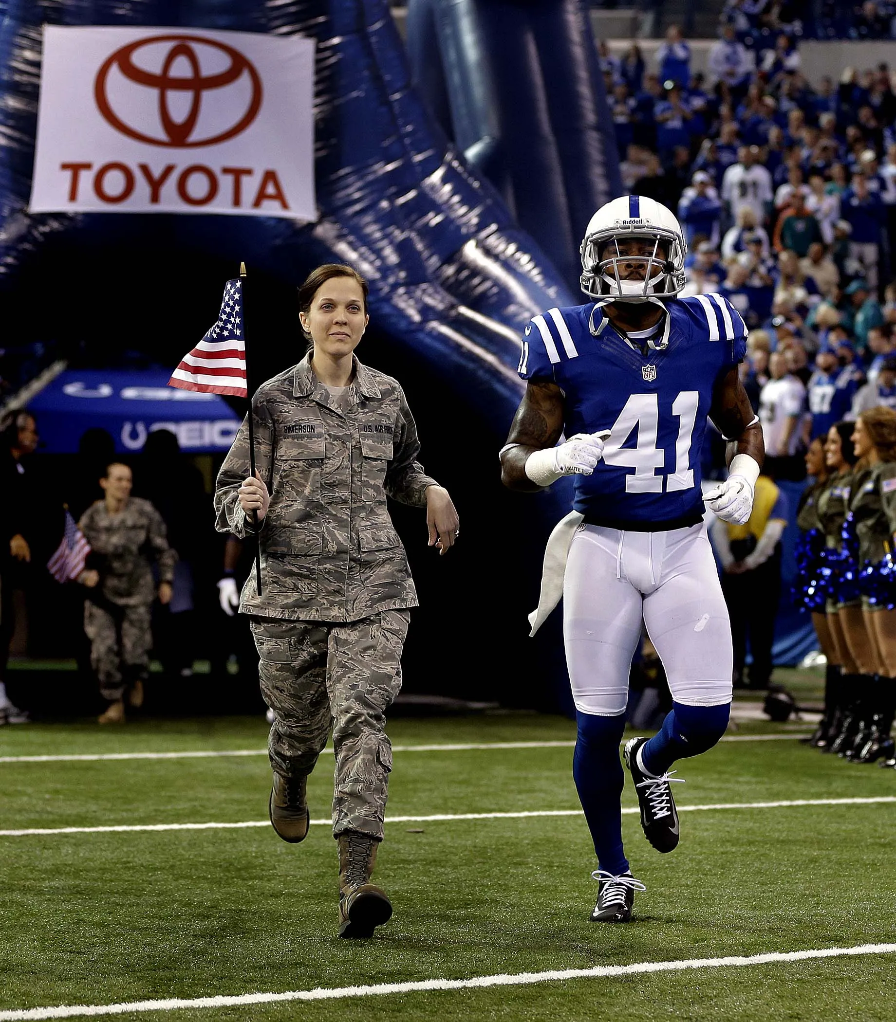 Indianapolis Colts free safety Antoine Bethea is escorted by a member of the military during introductions. (Photo by Darron Cummings/Associated Press)