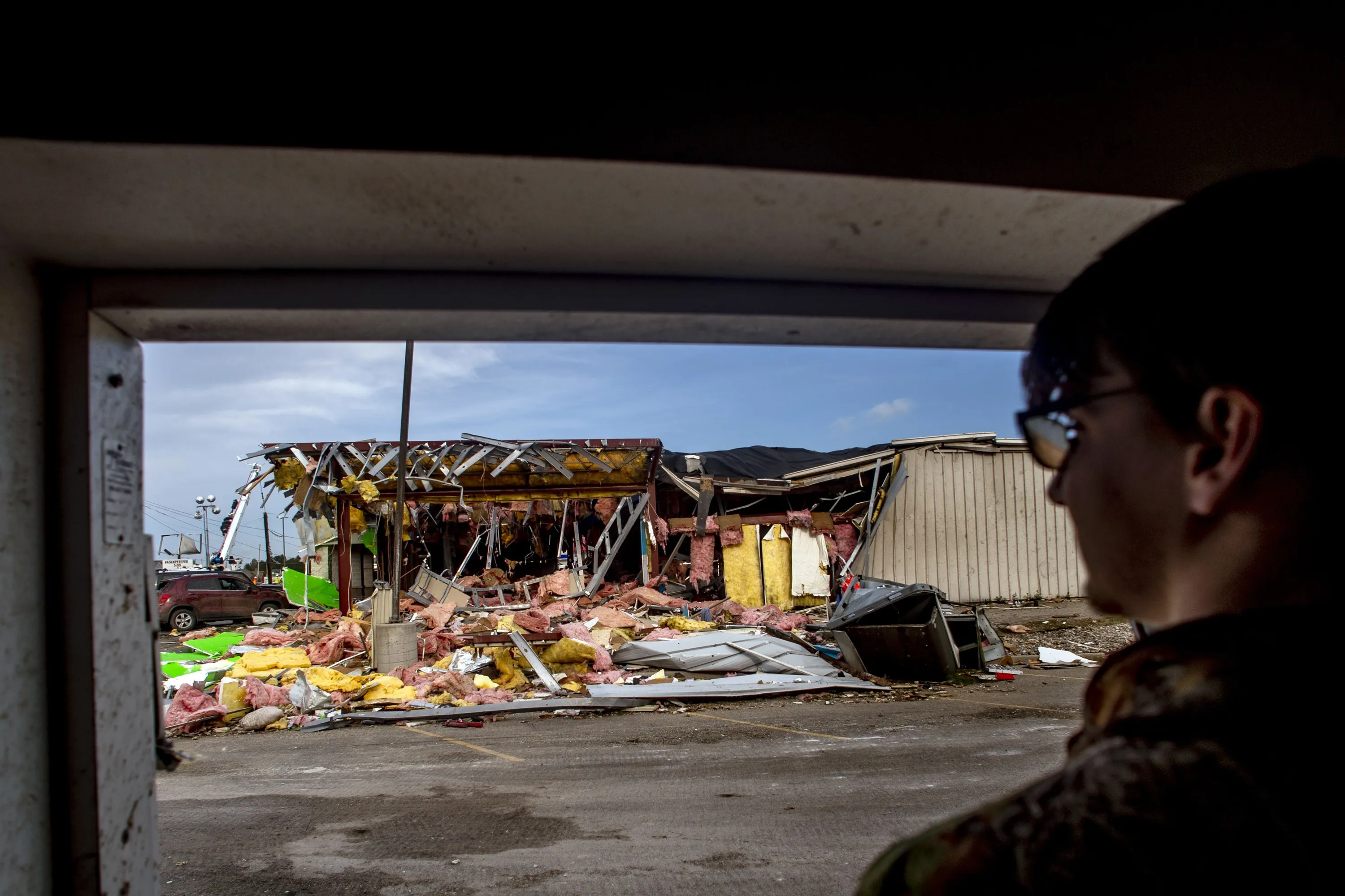 The remains of the Goodwill building seen through the shattered drive-through window at Little Caesars after a tornado ripped through in Gaylord, Michigan on May 21, 2022. (Photo by Jake May/AP Photo)