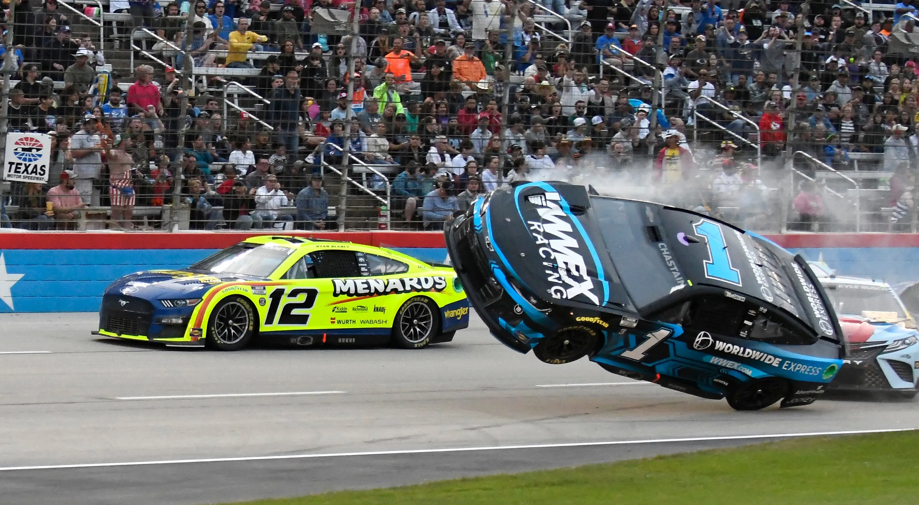 Ryan Blaney (12) passes by Ross Chastain (1) lifting off the track after making contact with Kyle Busch, right, during the NASCAR All-Star auto race at Texas Motor Speedway in Fort Worth, Texas, Sunday, May 22, 2022. (Photo by Randy Holt/AP Photo)