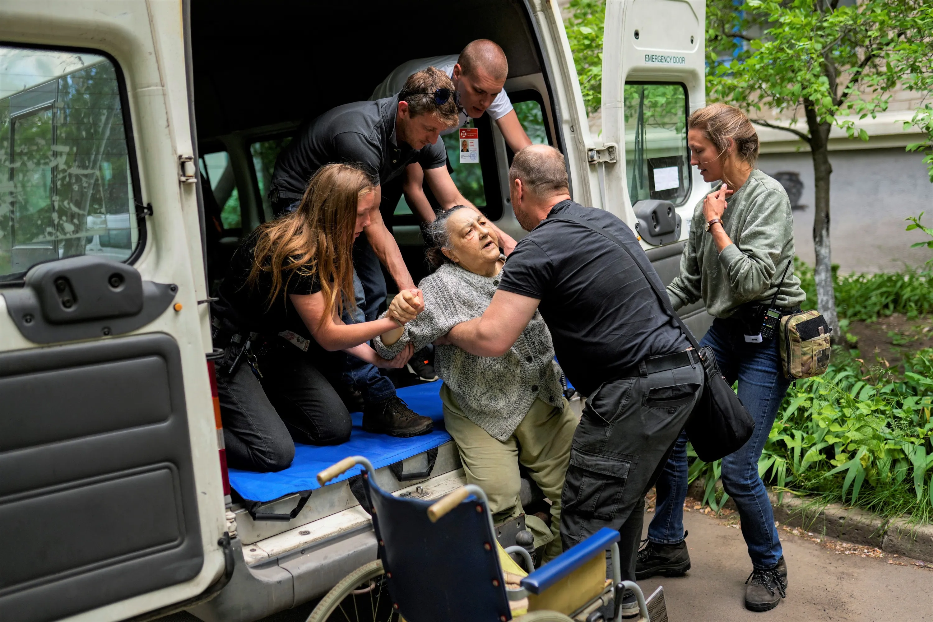 A woman is carried from her home in an evacuation by British volunteers group BEAR in Bakhmut, eastern Ukraine, Friday, May 27, 2022. Volunteers have been racing to evacuate as many civilians as possible, particularly the elderly and those with mobility issues, as Russian forces make advances in the region. (Photo by Francisco Seco/AP Photo)