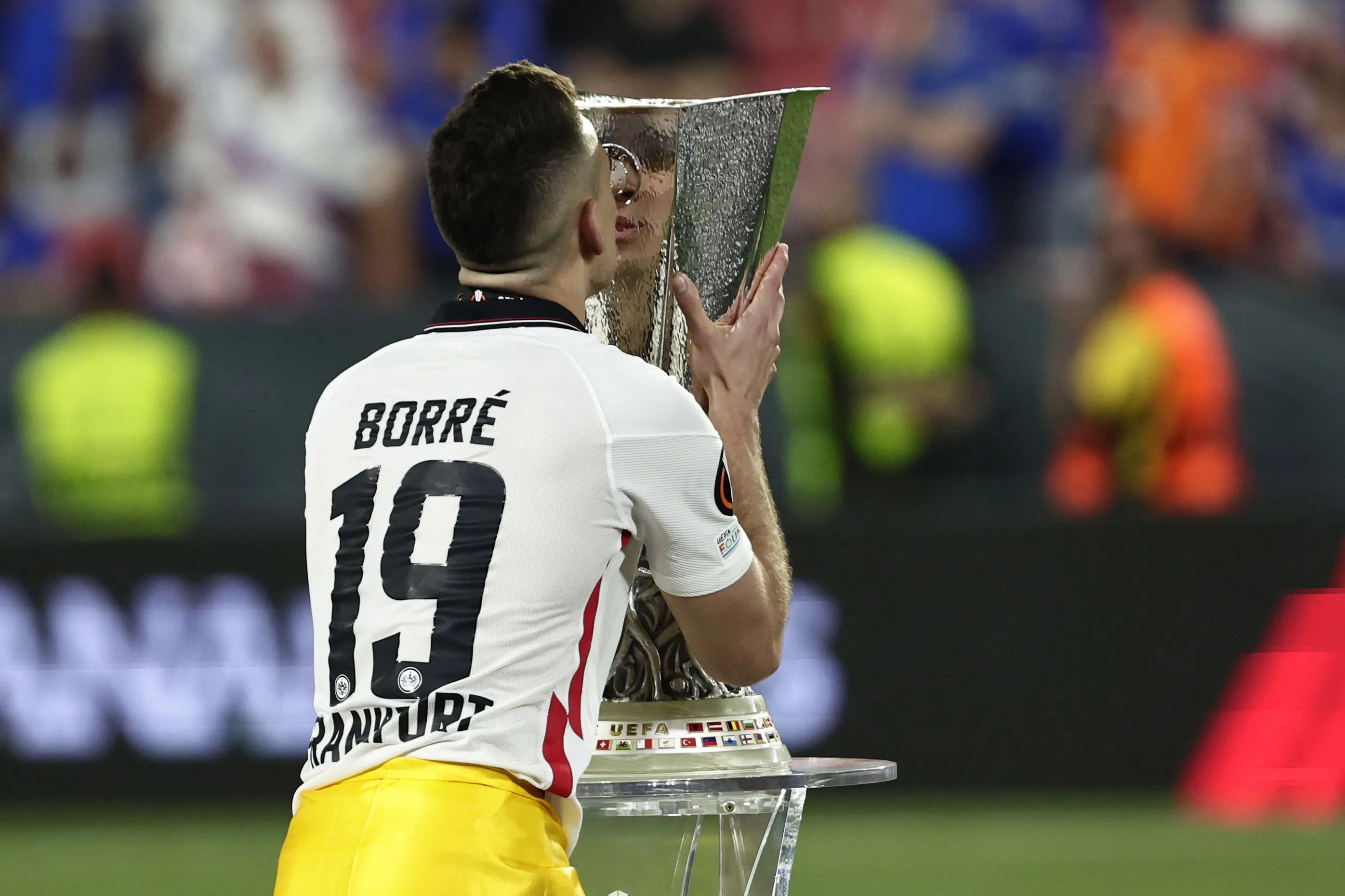 Frankfurt's Rafael Santos Borre kisses the trophy for winners of the Europa League final soccer match between Eintracht Frankfurt and Rangers FC at the Ramon Sanchez Pizjuan stadium in Seville, Spain, Thursday, May 19, 2022. (Photo by Pablo Garcia/AP Photo)