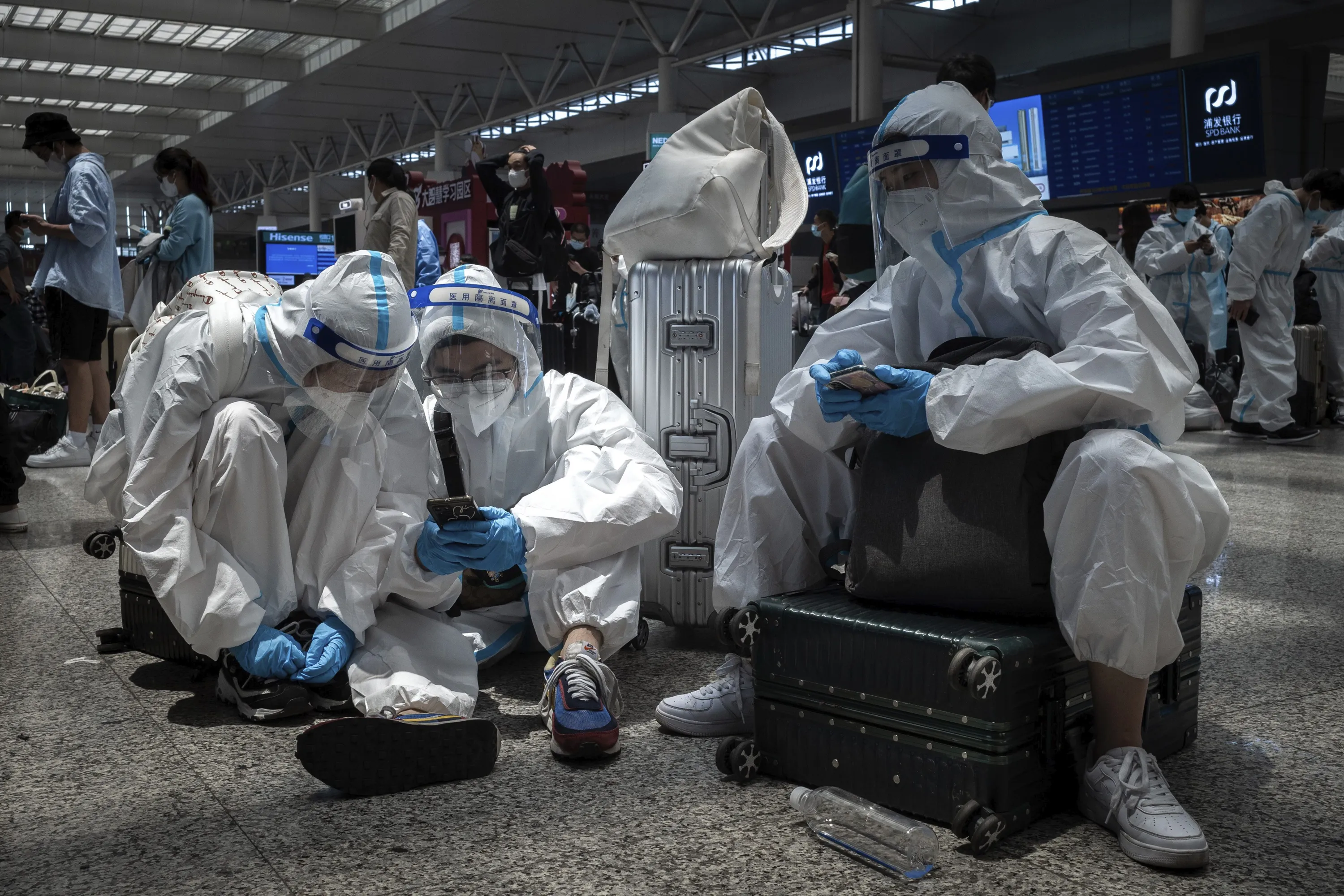 Passengers in protective overalls wait for their train at the Hongqiao Railway Station in Shanghai, China Sunday, May 22, 2022. The locked-down Chinese metropolis of Shanghai opens some public transit services as it slowly eases pandemic restrictions that have kept most residents in their housing complexes for more than six weeks. (Photo by Chinatopix via AP Photo)