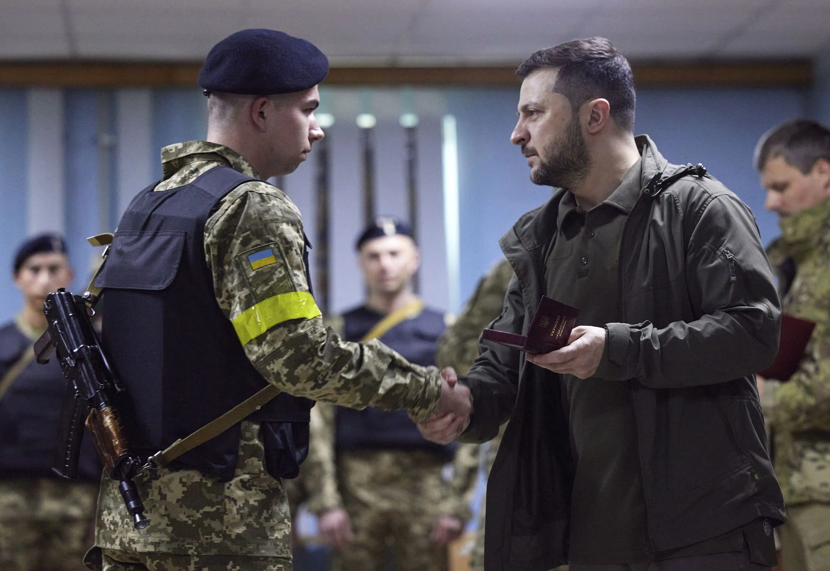 In this photo provided by the Ukrainian Presidential Press Office on Sunday, May 29, 2022, Ukrainian President Volodymyr Zelenskyy, right, awards a servicewoman as he visits the war-hit Kharkiv region. Volodymyr Zelenskyy described the situation in the east as “indescribably difficult”. The “Russian army is trying to squeeze at least some result” by concentrating its attacks there, he said in a Saturday night video address. Photo by Ukrainian Presidential Press Office via AP Photo)