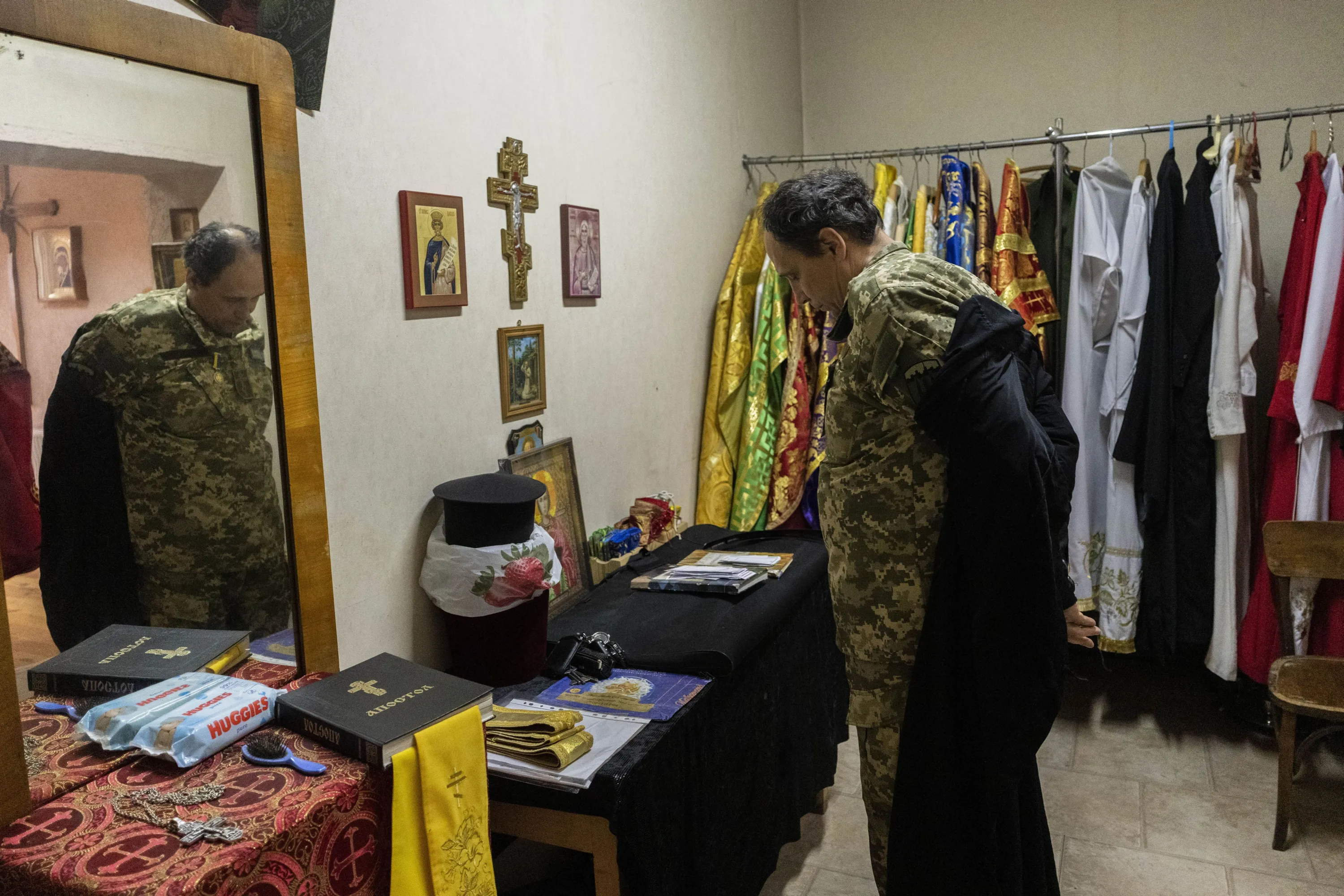 Ukrainian Army Chaplain Vasyl removes his habit after a Sunday mass at a Ukrainian Orthodox church in Kharkiv, eastern Ukraine, Sunday, May 29, 2022. (Photo by Bernat Armangue/AP Photo)