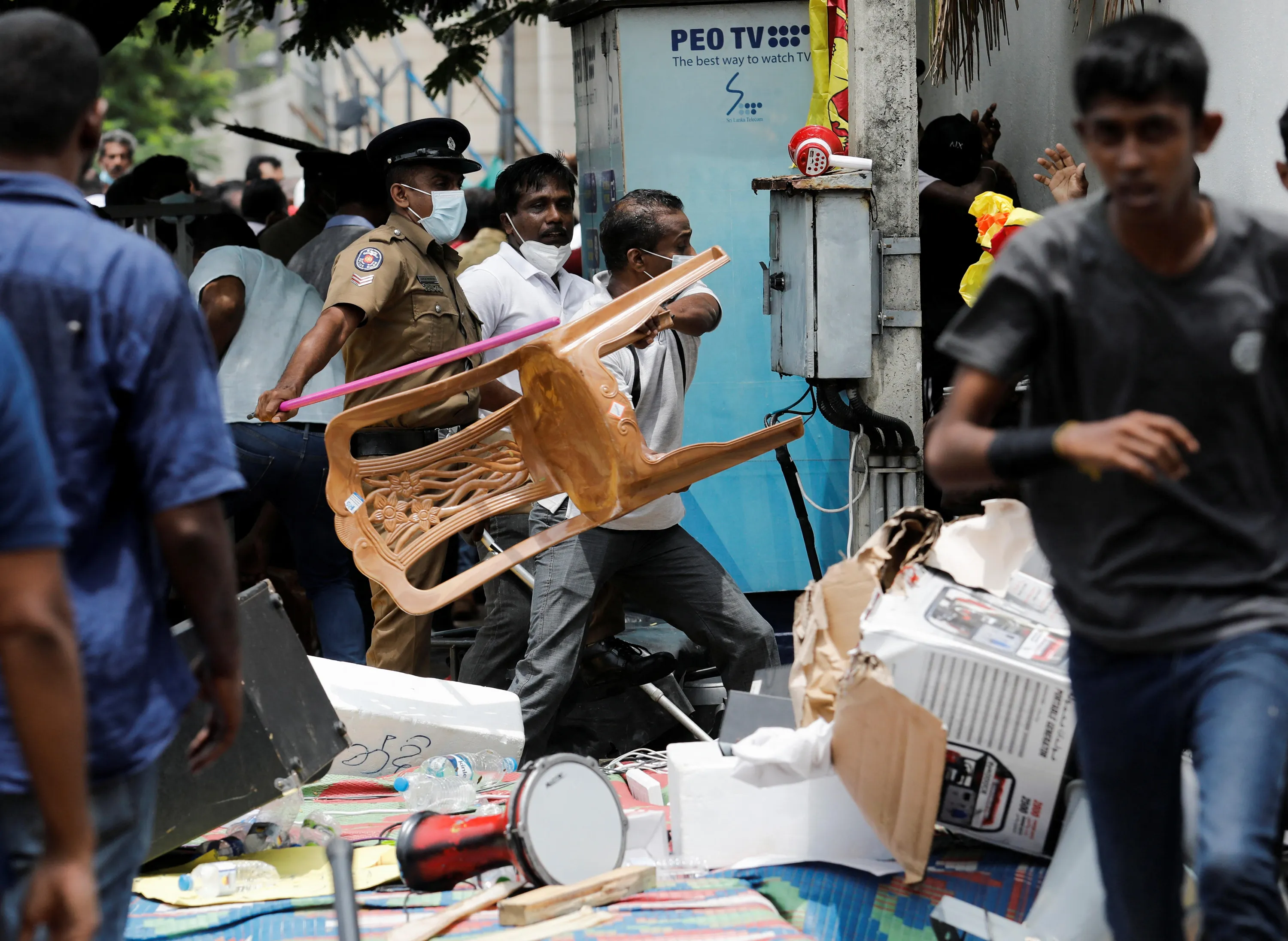 Supporters of Sri Lanka's ruling party destroy tents belonging to anti-government demonstrators, during a clash between the two groups, in front of the Prime Minister's official residence, amid the country's economic crisis, in Colombo, Sri Lanka, May 9, 2022. (Photo by Dinuka Liyanawatte/Reuters)