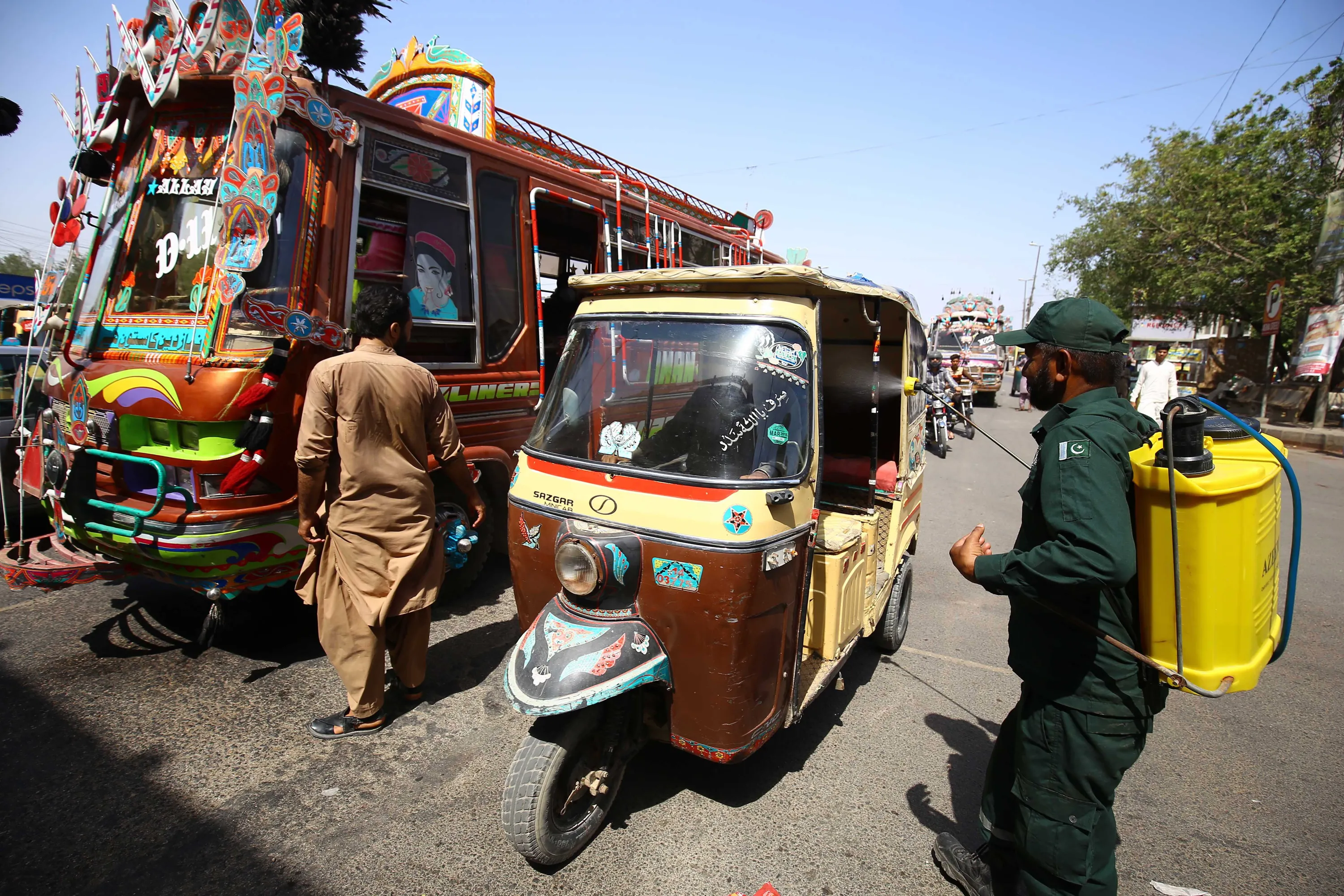 Volunteers spray cool water on people along a street as a heat wave continues in Karachi, Pakistan, 15 May 2022. The Pakistan Meteorological Department (PMD) said that a severe heatwave that has been affecting central and upper Sindh will affect the entire province, including Karachi, for nearly a week since 11 May, with maximum temperatures expected to exceed 40 degrees Celsius in the provincial capital. (Photo by Shahzaib Akber/EPA/EFE)