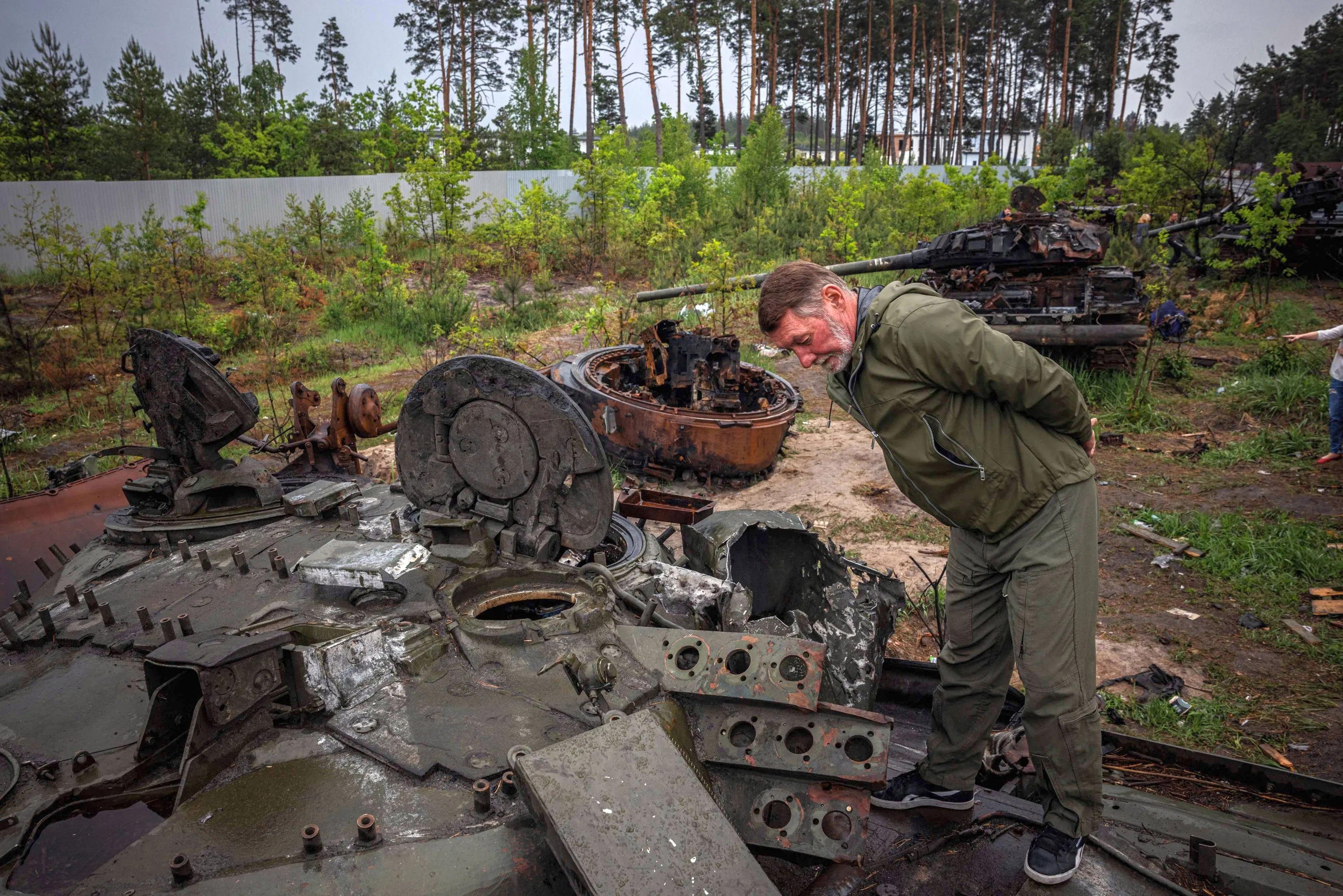 A local resident examines a destroyed Russian tank outside Kyiv on May 31, 2022, amid the Russian invasion of Ukraine. (Photo by Dimitar Dilkoff/AFP Photo)
