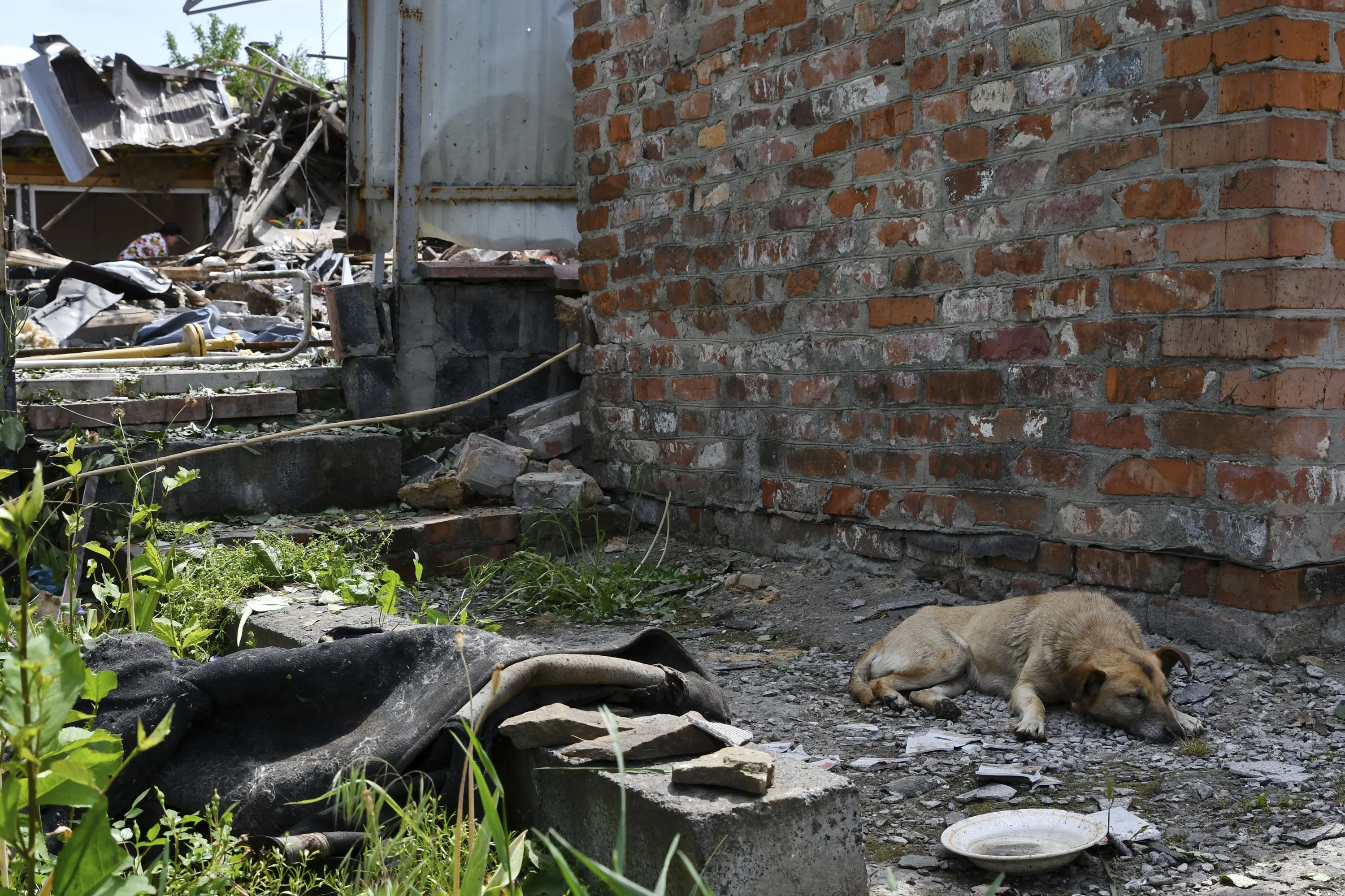A survived dog lies next to a building damaged by an overnight missile strike in Sloviansk, Ukraine, Wednesday, June 1, 2022. (Photo by Andriy Andriyenko/AP Photo)