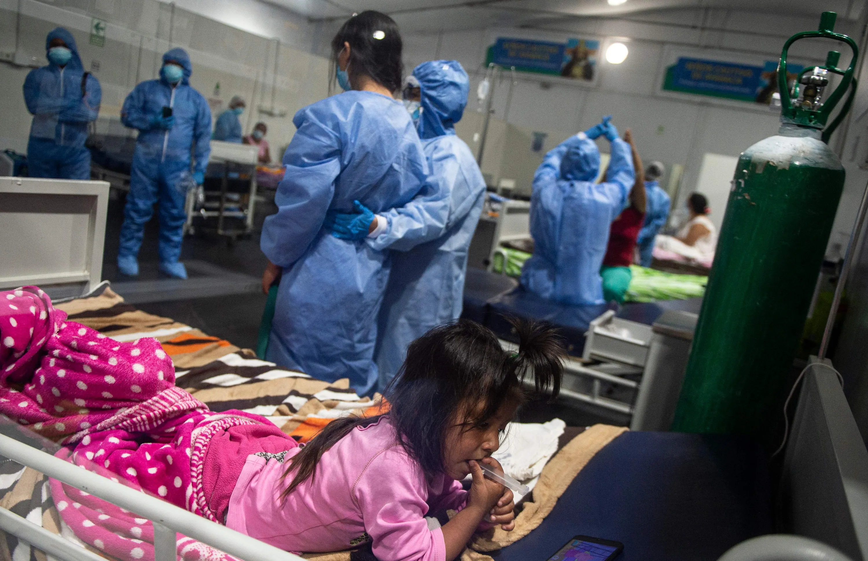 Cruz Jara, a Covid-19 patient, is helped by a health professional next to her daughter, who is also infected, in the Intensive Care Unit of the Virgen de Fatima contingency hospital, which was built within the facilities of the Campeones del 36 stadium, in Sullana, Piura, northern Peru, on October 19, 2021, amid the new coronavirus pandemic. (Photo by Ernesto Benavides/AFP Photo)
