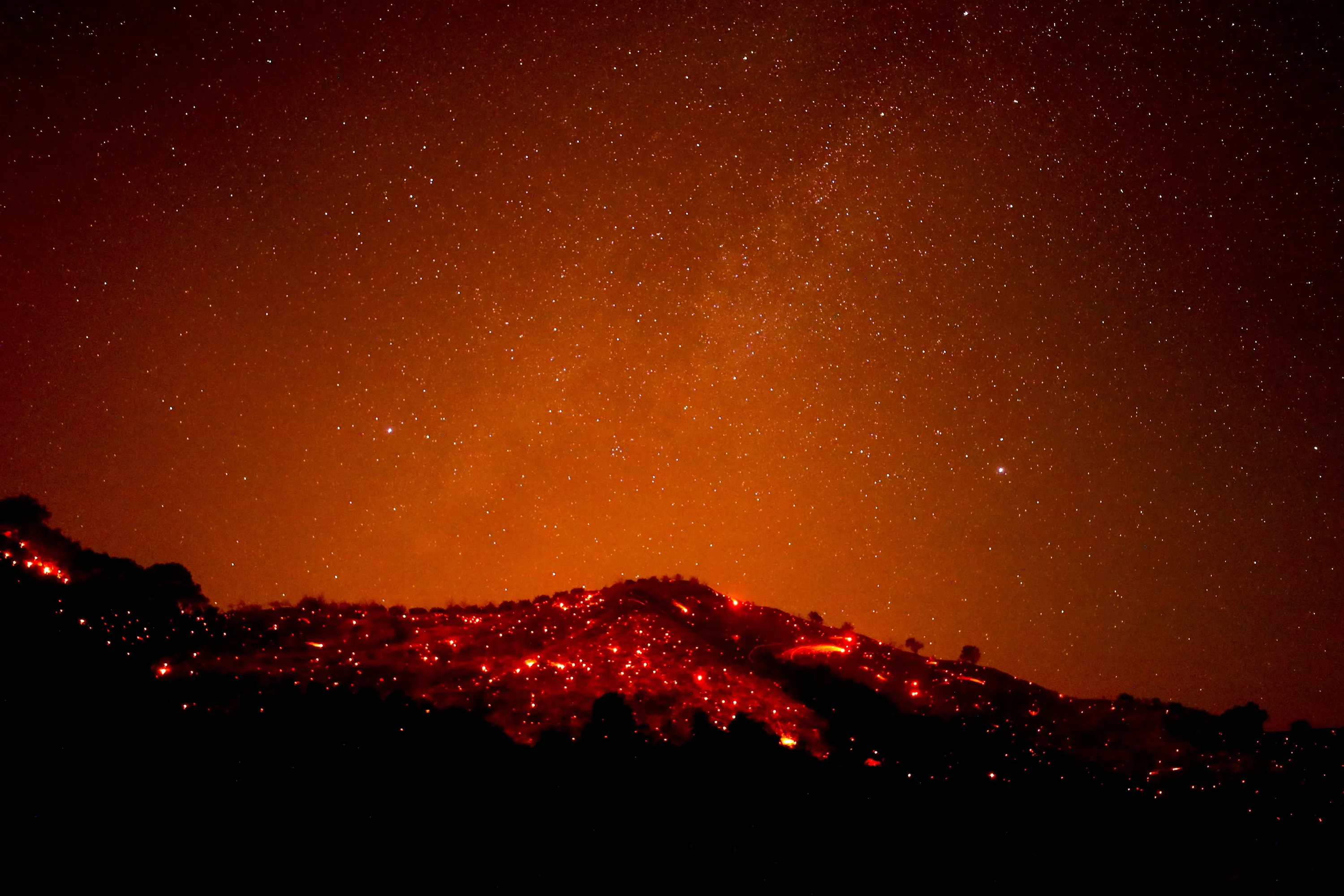 A hill scorched by the Alisal Fire casts an orange glow under the stars in the canyons near Goleta, east of Santa Barbara, California, USA, 13 October 2021. According to the latest reports, the Windy Fire is 13,400 acres with five percent containment. (Photo by Etienne Laurent/EPA/EFE)