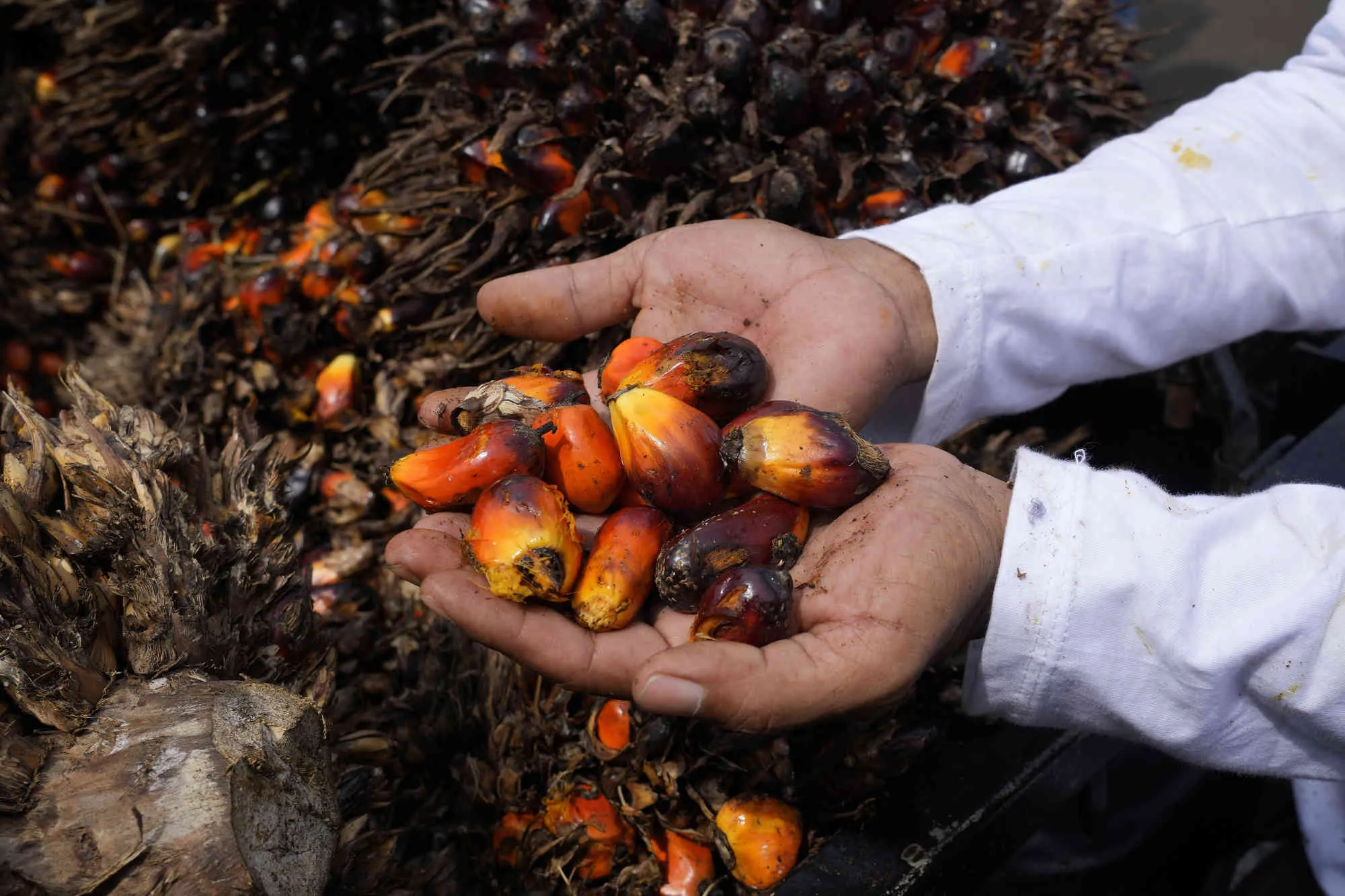 A farmer holds kernels of oil palm fruits during a protest near the presidential palace in Jakarta, Indonesia, Tuesday, May 17, 2022. Dozens of palm oil farmers staged the rally urging the government to lift the ban on palm oil exports, saying that it has caused significant drop to their income. Indonesia, one of the world's top palm oil exporters has banned exports of cooking oil and its raw materials to reduce domestic shortages and hold down skyrocketing prices since late last month. (Photo by Tatan Syuflana/AP Photo)