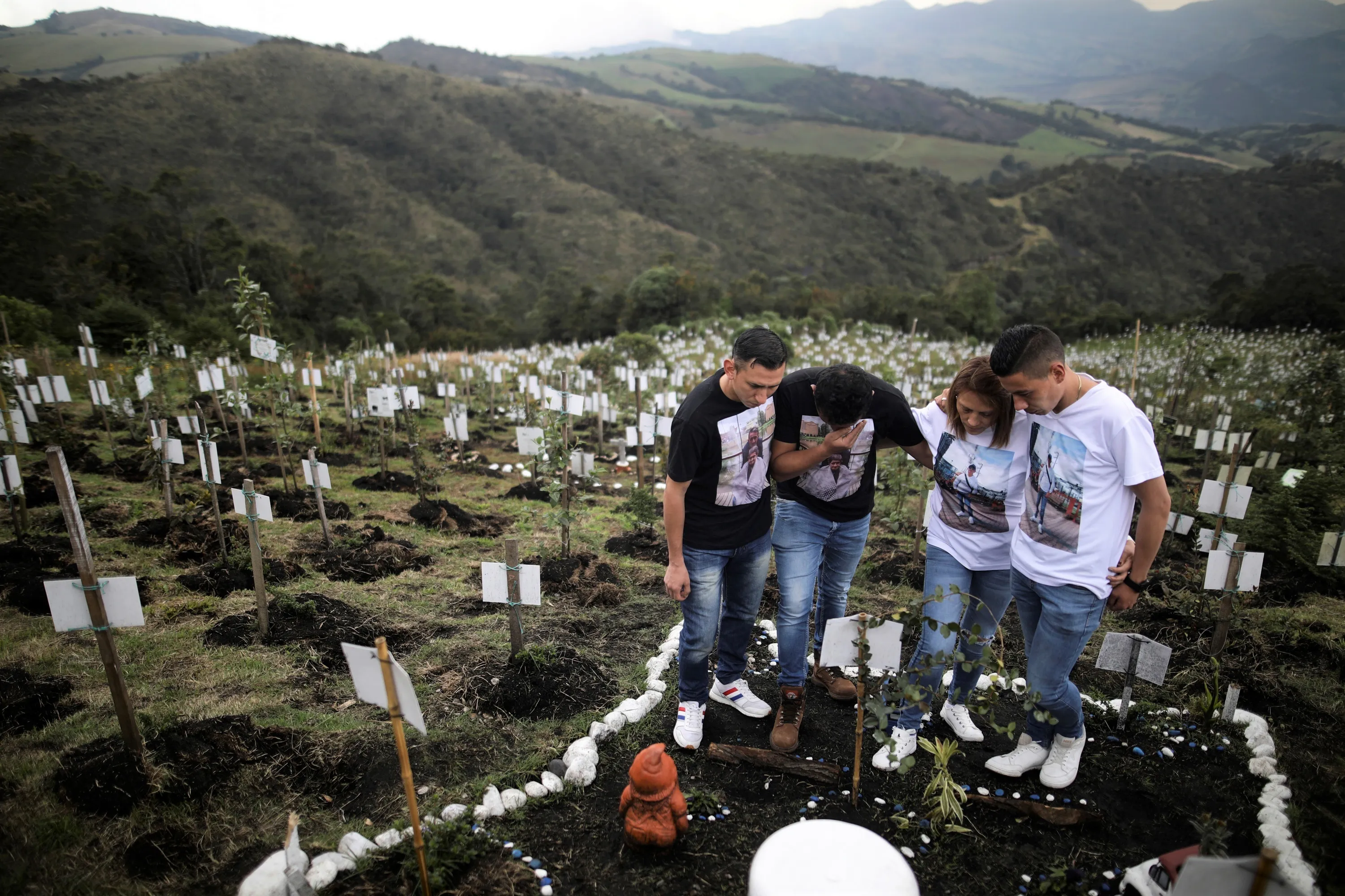 Relatives of Luis Enrique Rodriguez, who died of COVID-19, visit where he was buried on a hill at the El Pajonal de Cogua Natural Reserve, in Cogua, north of Bogota, Colombia, Monday, October 25, 2021. Rodriguez died May 14, 2021. Relatives bury the ashes of their loved ones who died of coronavirus and plant a tree in their memory. (Photo by Ivan Valencia/AP Photo)
