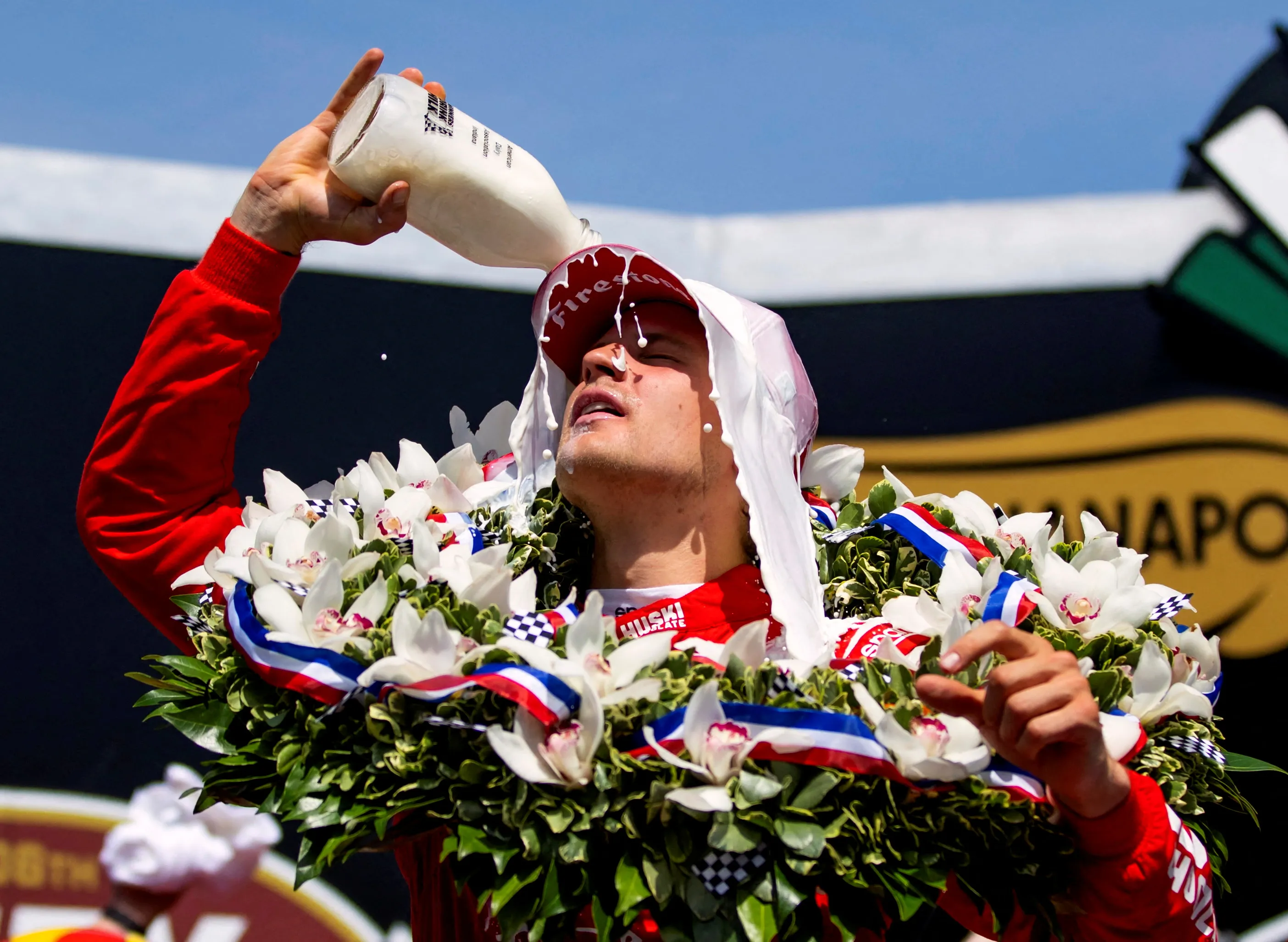 IndyCar Series driver Marcus Ericsson celebrates with the milk after winning the Indianapolis 500 at Indianapolis Motor Speedway in Indianapolis, Indiana on May 29, 2022. (Photo by Mark J. Rebilas/USA TODAY Sports)