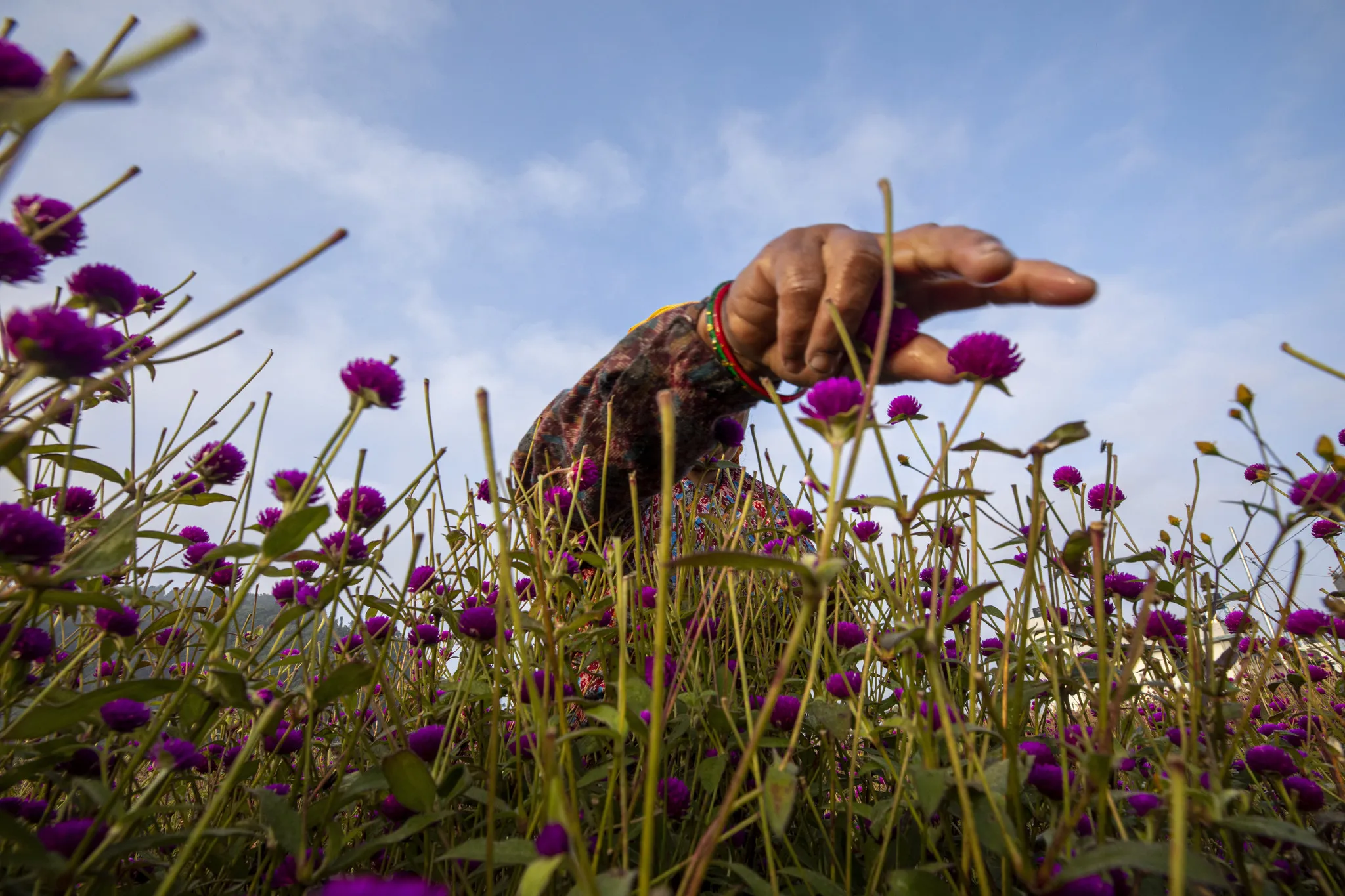 A Nepalese woman collects globe amaranth flowers, the typical flower for Diwali, also known as Tihar festival, in the village of Gundu, Bhaktapur, Nepal, 28 October 2021. The globe amaranth flower is mostly used for garlands to worship gods and animals during the Tihar festival. Starting from 03 November 2021, the five-day festival is the second major event for Nepalese people. (Photo by Narendra Shrestha/EPA/EFE)