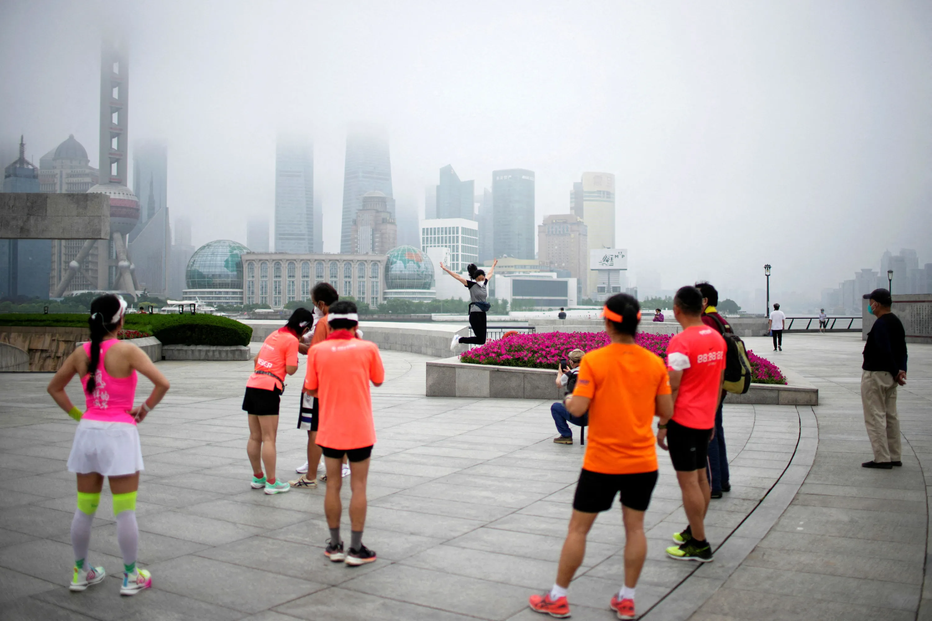 A woman poses for a jump shot on the Bund, in front of buildings in the Lujiazui financial district, after the lockdown placed to curb the coronavirus disease (COVID-19) outbreak was lifted in Shanghai, China on June 1, 2022. (Photo by Aly Song/Reuters)