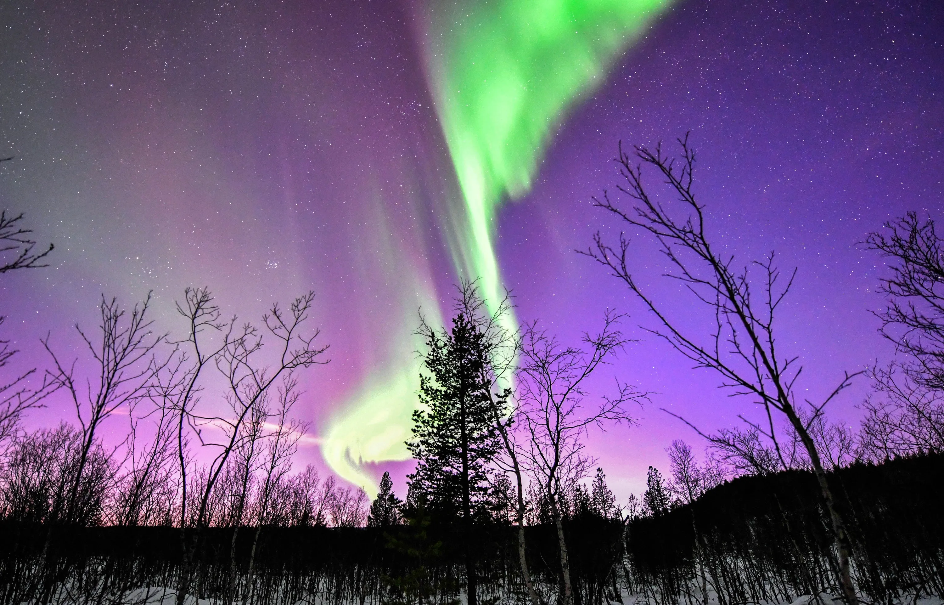 Northern lights are pictured over a forest in Russia's Murmansk Region on January 25, 2022. The Murmansk Region, located in the Arctic Circle, is one of Russia's best places for seeing northern lights. (Photo by Lev Fedoseyev/TASS)