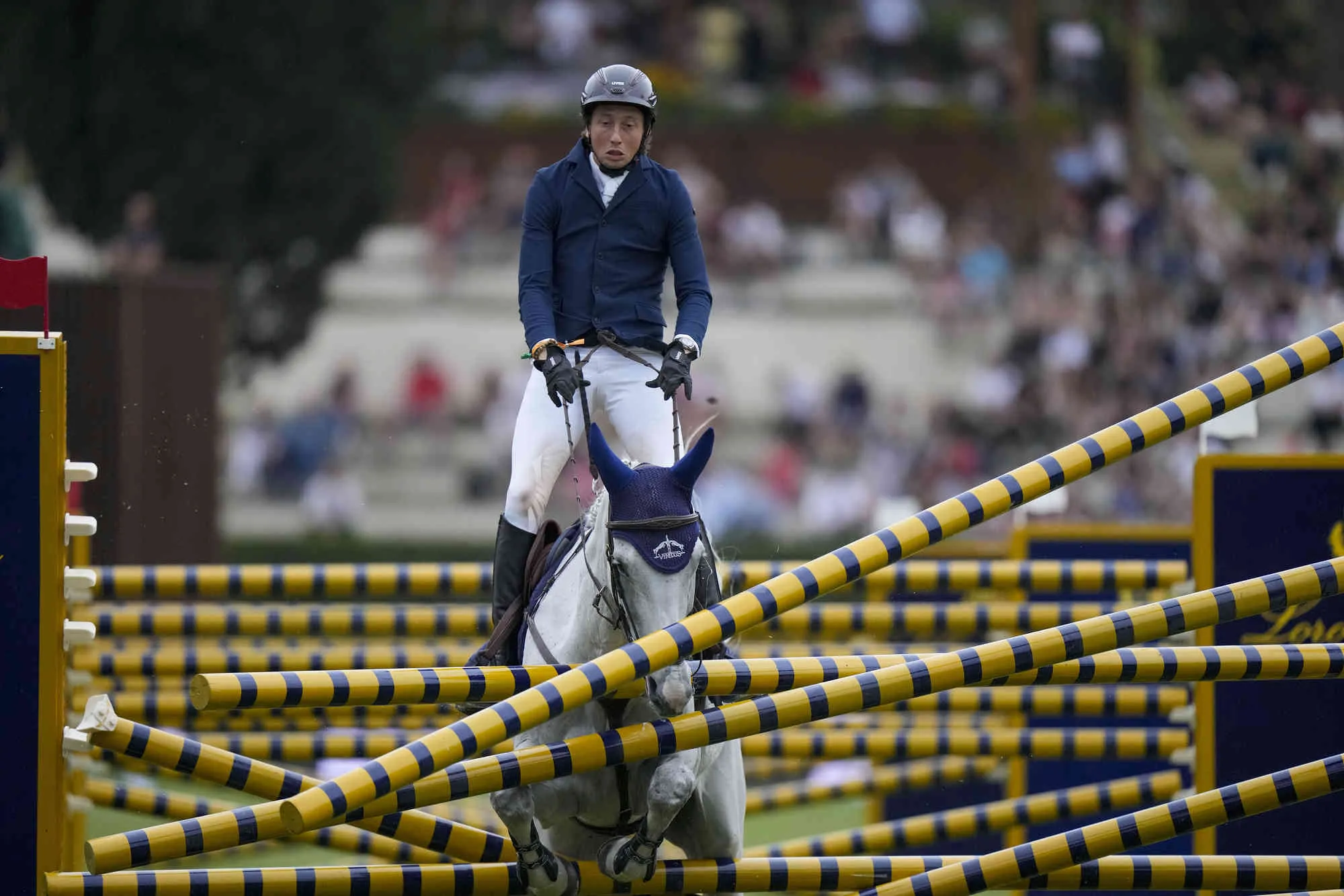 Switzerland's Martin Fuchs on Leone Jesi crashes as he competes in the Six Bars horse jumping competition at Rome's horse show, Saturday, May 28, 2022. (Photo by Andrew Medichini/AP Photo)