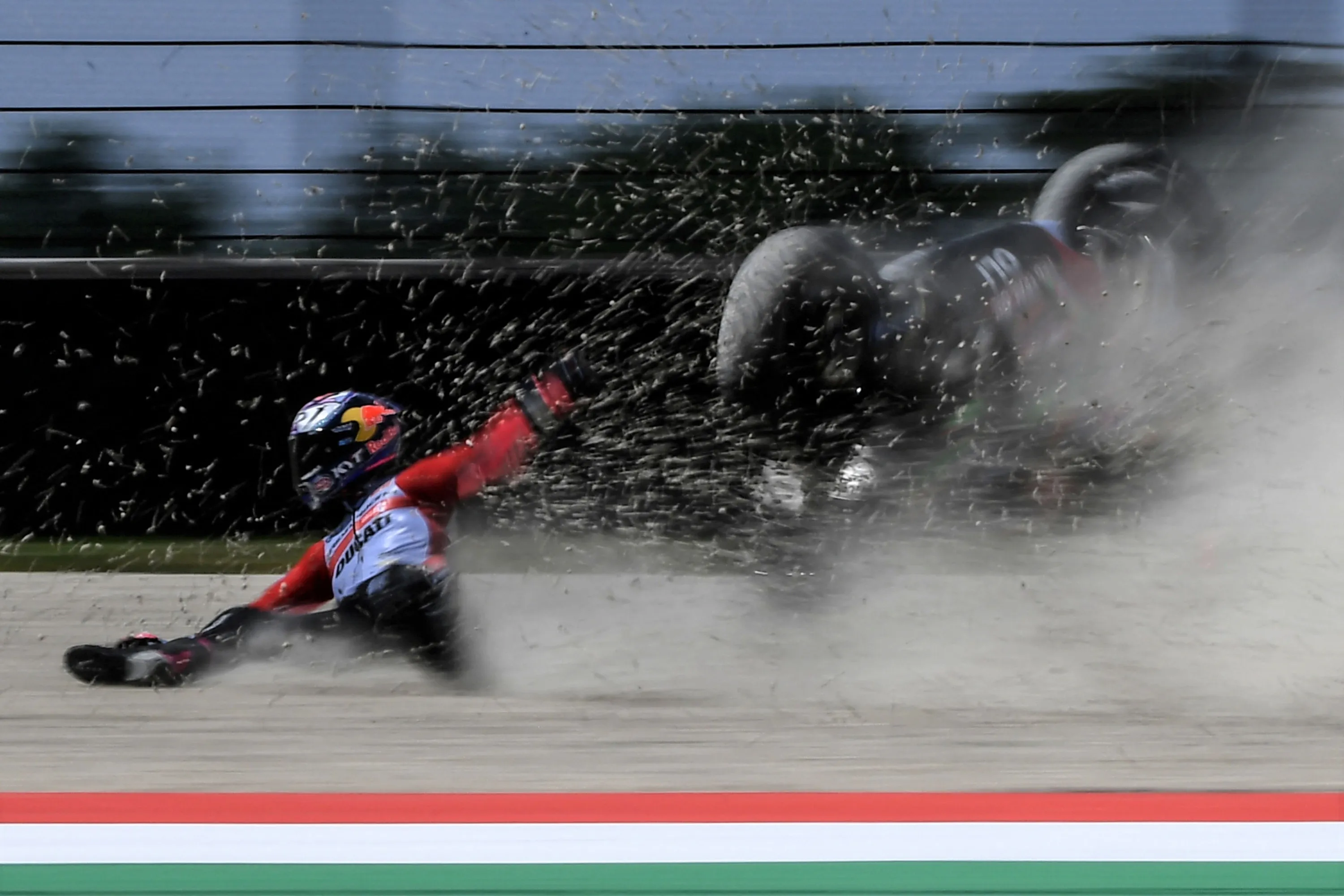 Gresini Racing Ducati's Italian rider Enea Bastianini falls during free practice 3 ahead the Italian Moto GP Grand Prix at the Mugello race track, Tuscany, on May 28, 2022. (Photo by Filippo Monteforte/AFP Photo)