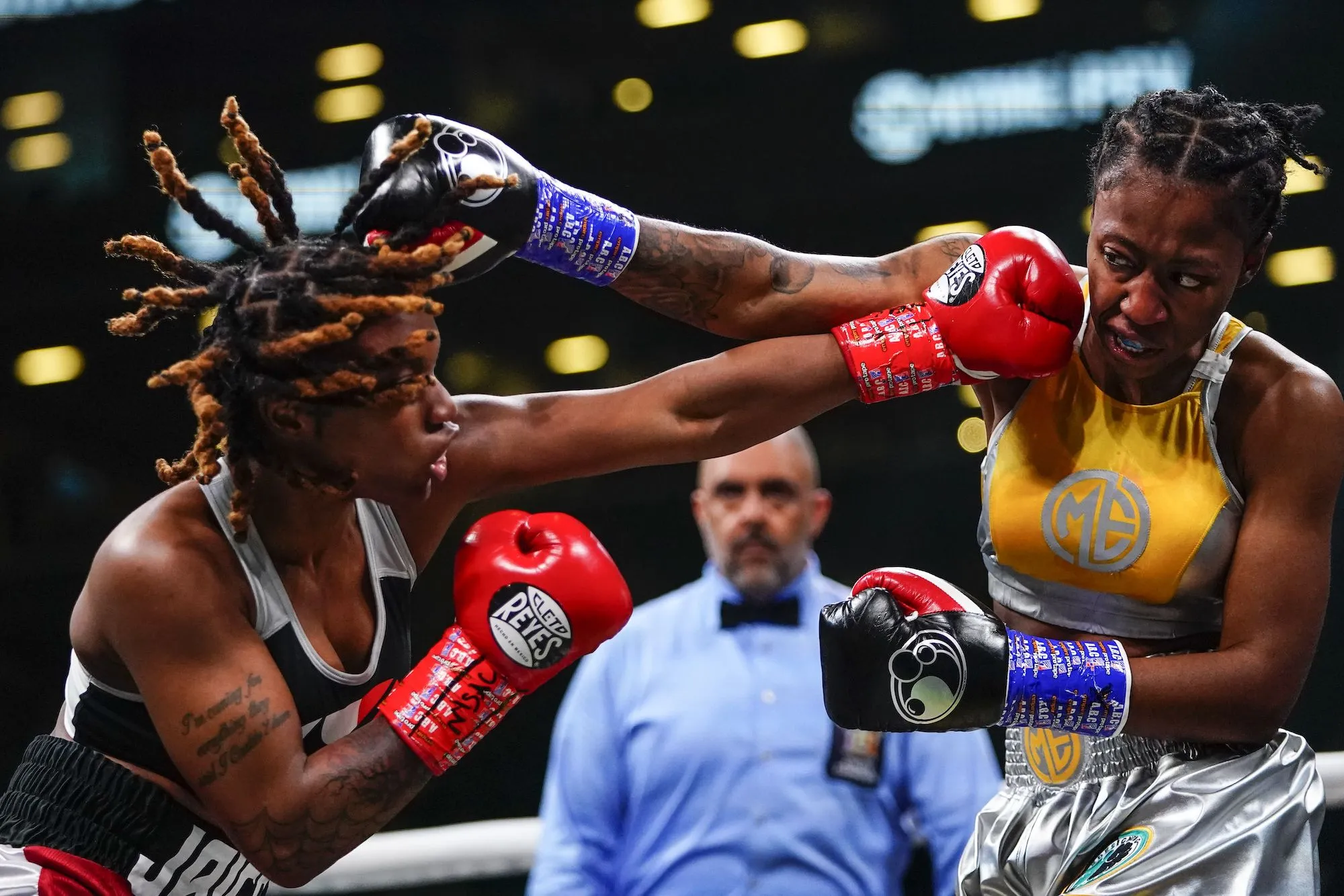 Haiti's Jaica Pavilus, left, throws a left at Mia Ellis during the first round of a lightweight boxing bout Saturday, May 28, 2022, in New York. Pavilus won the fight. (Photo by Frank Franklin II/AP Photo)