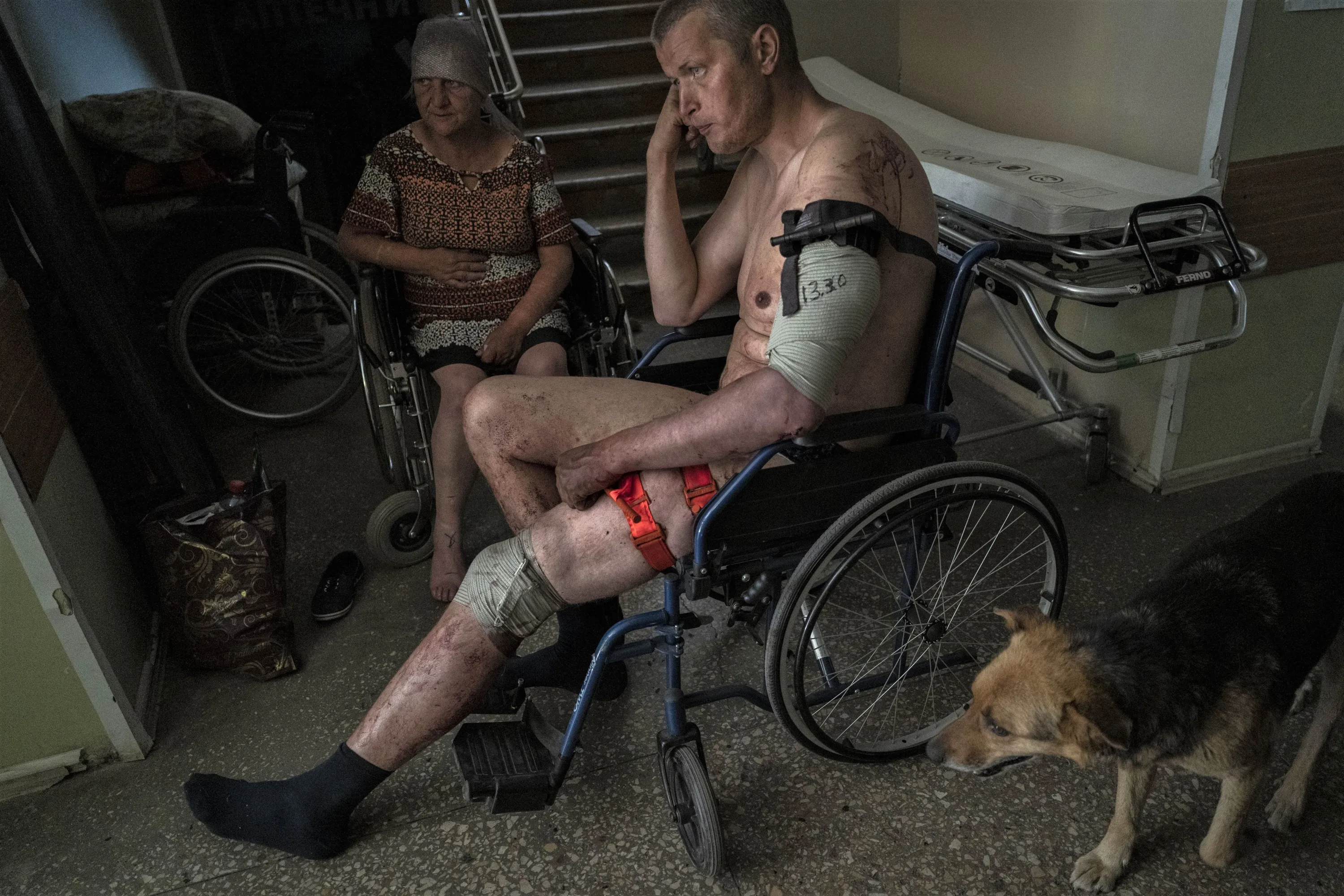 A Ukrainian injured serviceman and an injured civilian wait for medical treatment in the Donetsk region, eastern Ukraine, Tuesday, June 7, 2022. (Photo by Bernat Armangue/AP Photo)