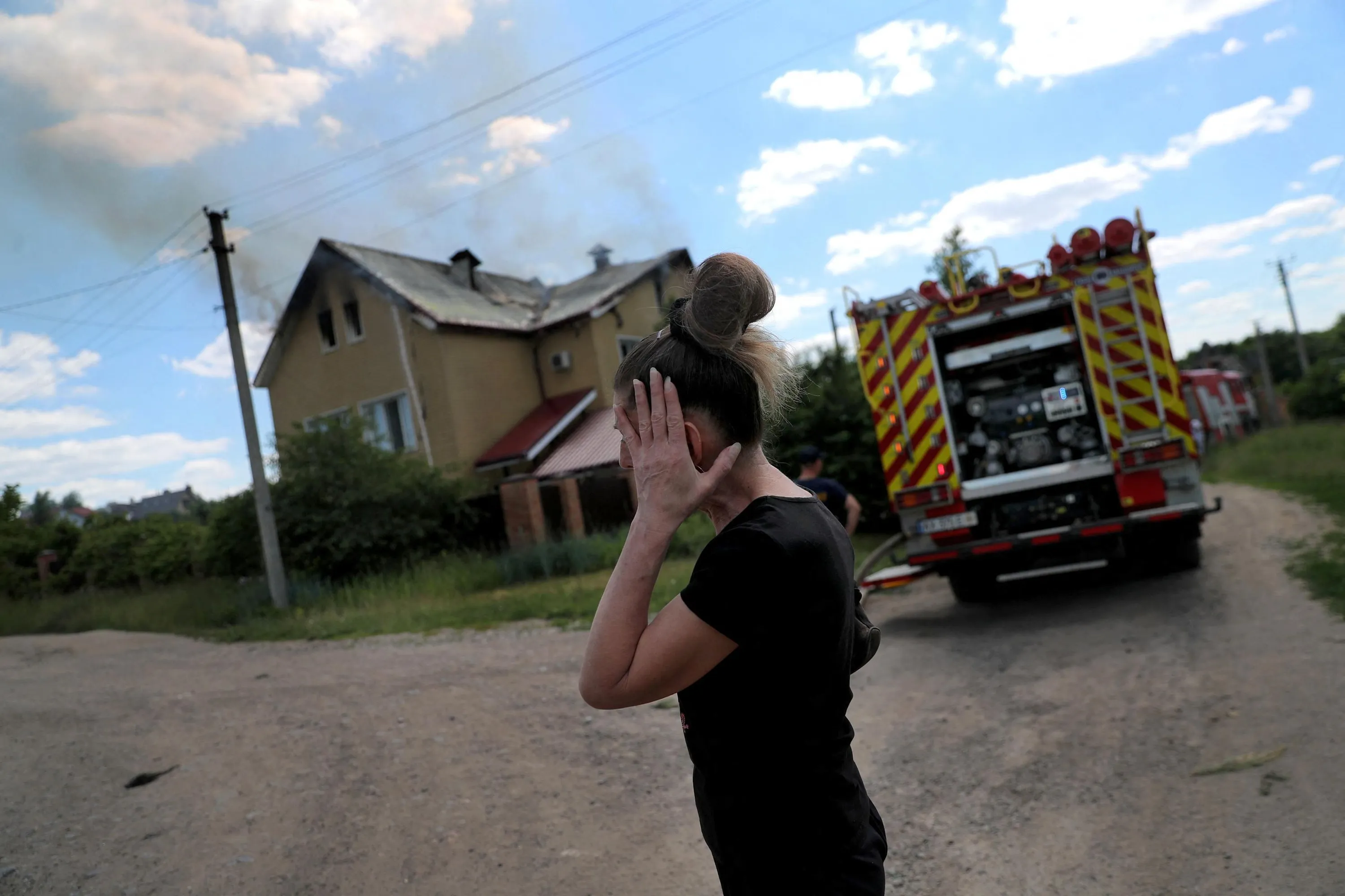 A woman reacts in front of a house during a fire following a military strike, amid Russia's attack on Ukraine, at a residential area in Kharkiv, Ukraine on June 7, 2022. (Photo by Ivan Alvarado/Reuters)