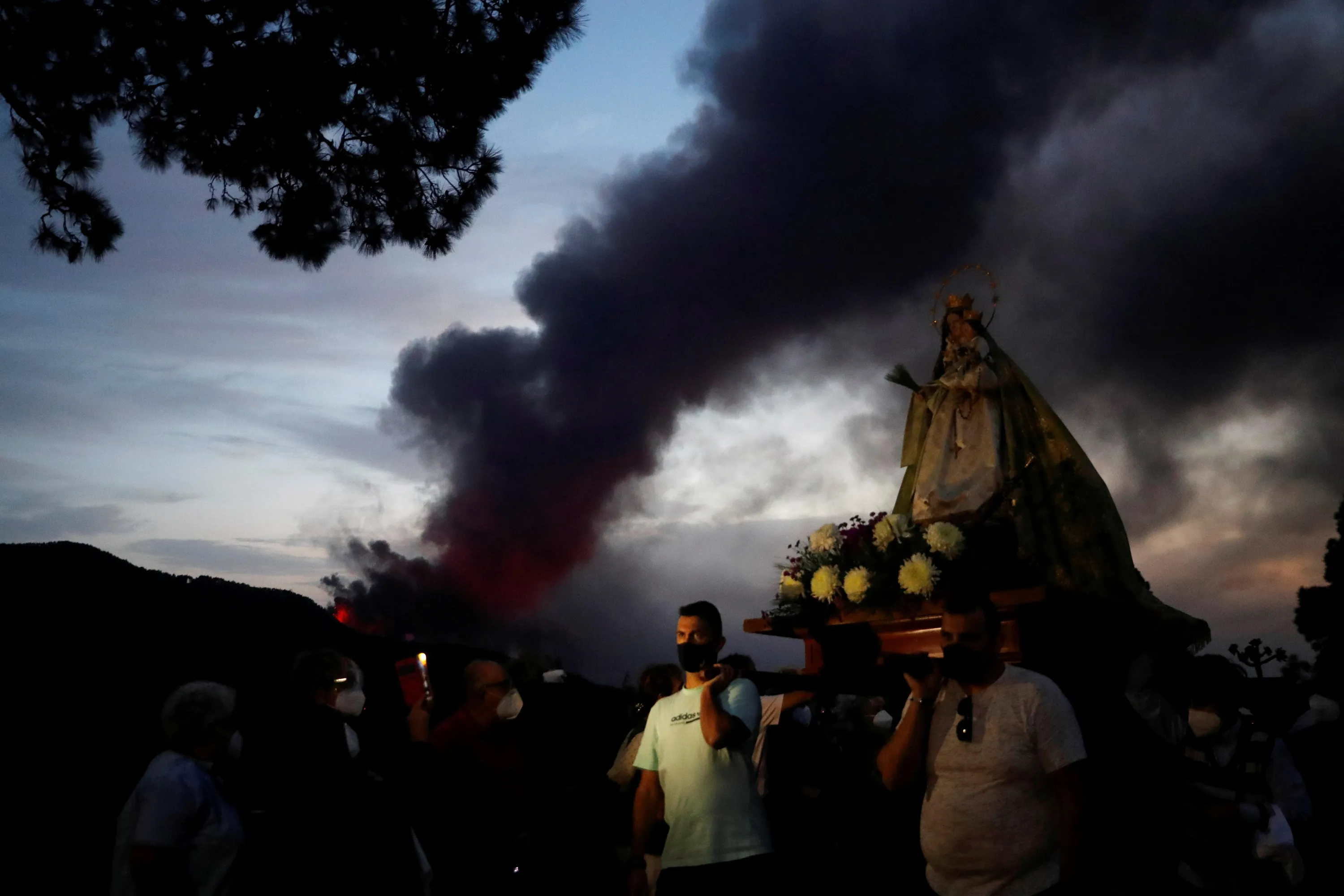 Faithful walk in a procession with the Virgen del Pino (The Pine Virgin) around its chapel to pray for the Cumbre Vieja volcano to stop as it continues to erupt in the background at El Paso, on the Canary Island of La Palma, Spain, October 19, 2021. (Photo by Susana Vera/Reuters)