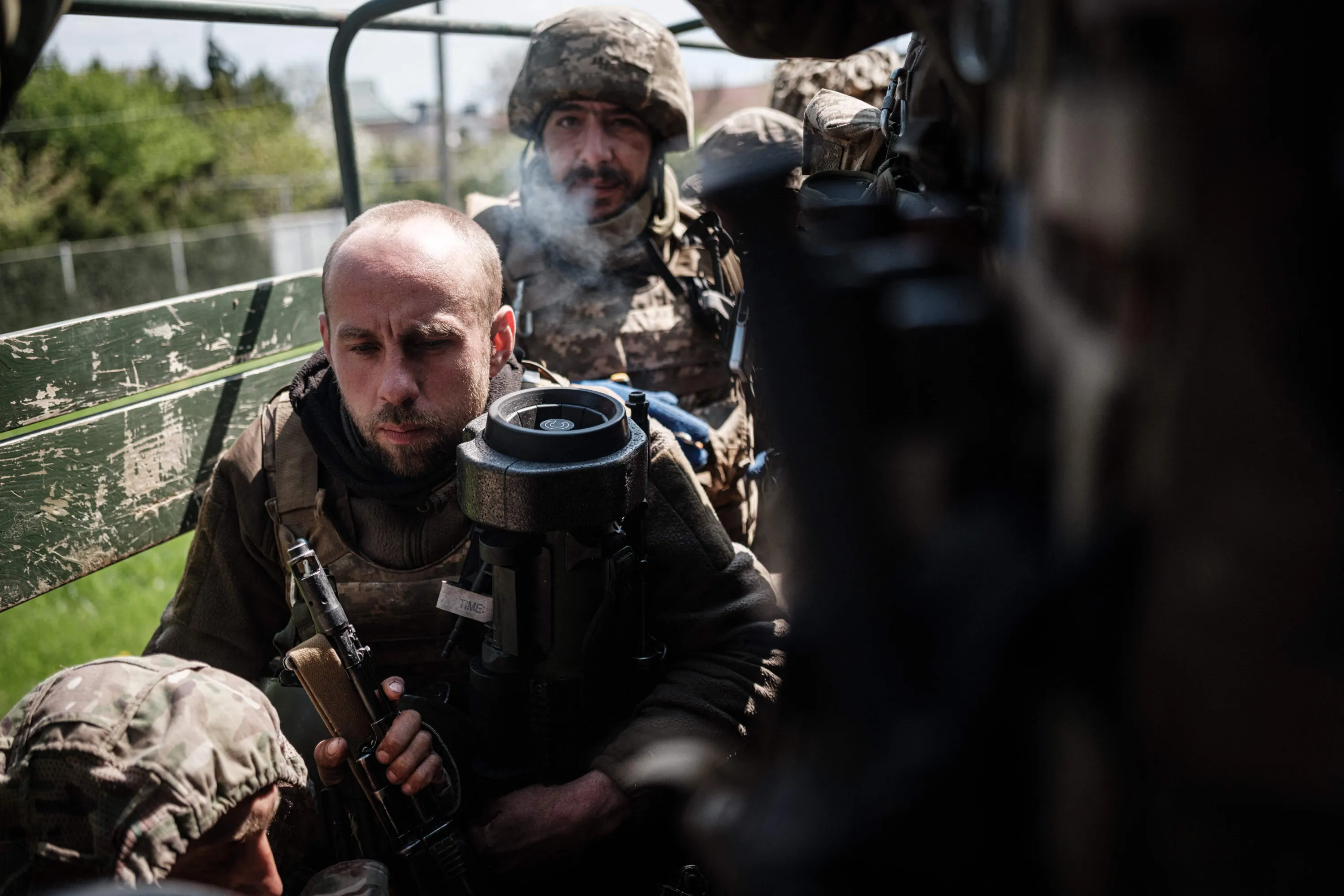 Ukrainian soliders ride on a truck to a resting place after fighting in the front line for two months near Kramatorsk, eastern Ukraine, on April 30, 2022, amid the Russian invasion of Ukraine. (Photo by Yasuyoshi Chiba/AFP Photo)