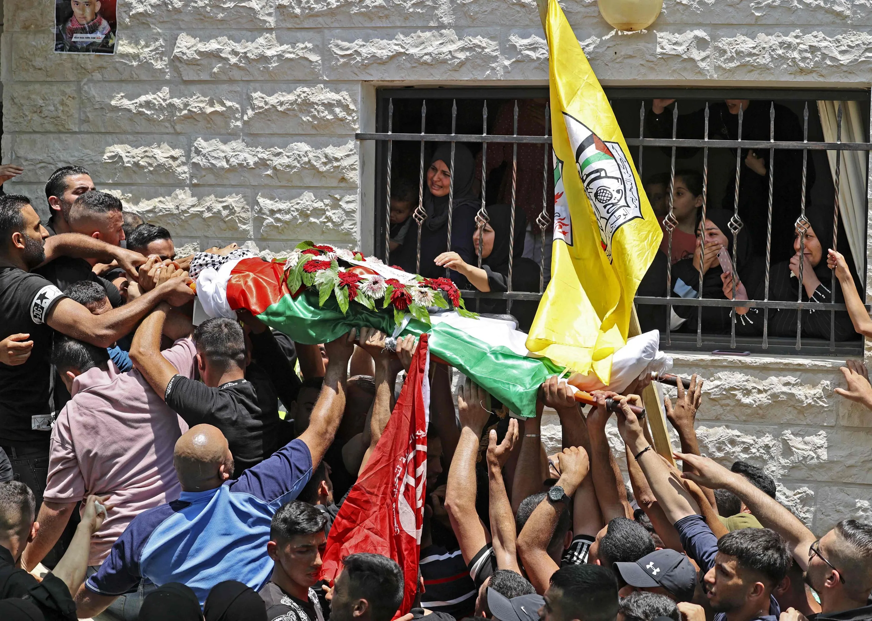 Palestinian mourners carry the body of 17-year-old Odeh Odeh, who was hit in the chest the day before by what the Palestinian health ministry said was an Israeli bullet, during his funeral in the village of Al-Madiya on June 3, 2022. The Israeli security forces have stepped up their operations in the West Bank in recent months, carrying out almost daily raids to arrest suspects after a spate of deadly attacks inside Israel. (Photo by Abbas Momani/AFP Photo)