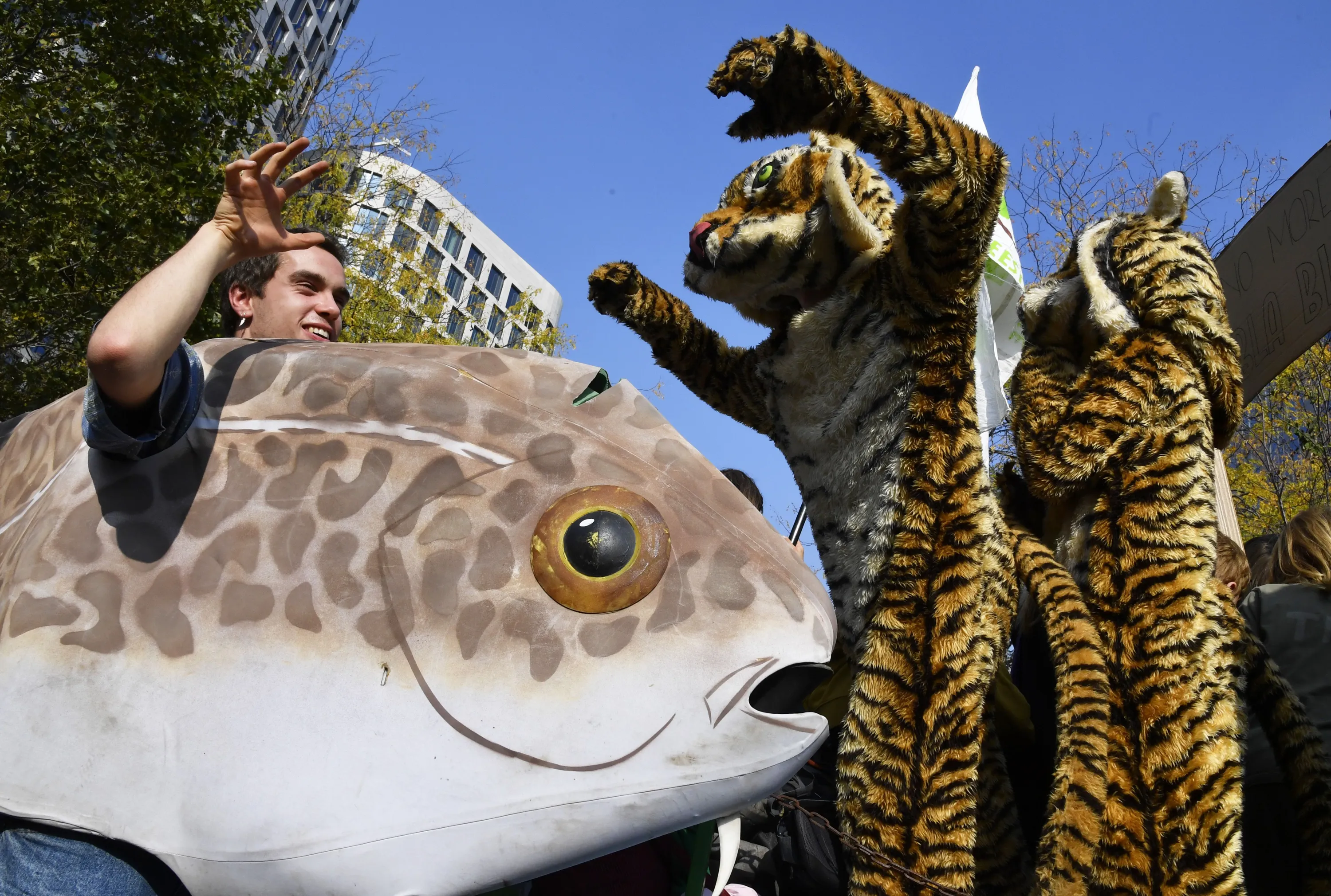 Climate activists wear costumes as they participate in a climate march in Brussels, Sunday, October 10, 2021. Some 80 organizations are joining in a climate march through Brussels to demand change and push politicians to effective action in Glasgow later this month. (Photo by Geert Vanden Wijngaert/AP Photo)