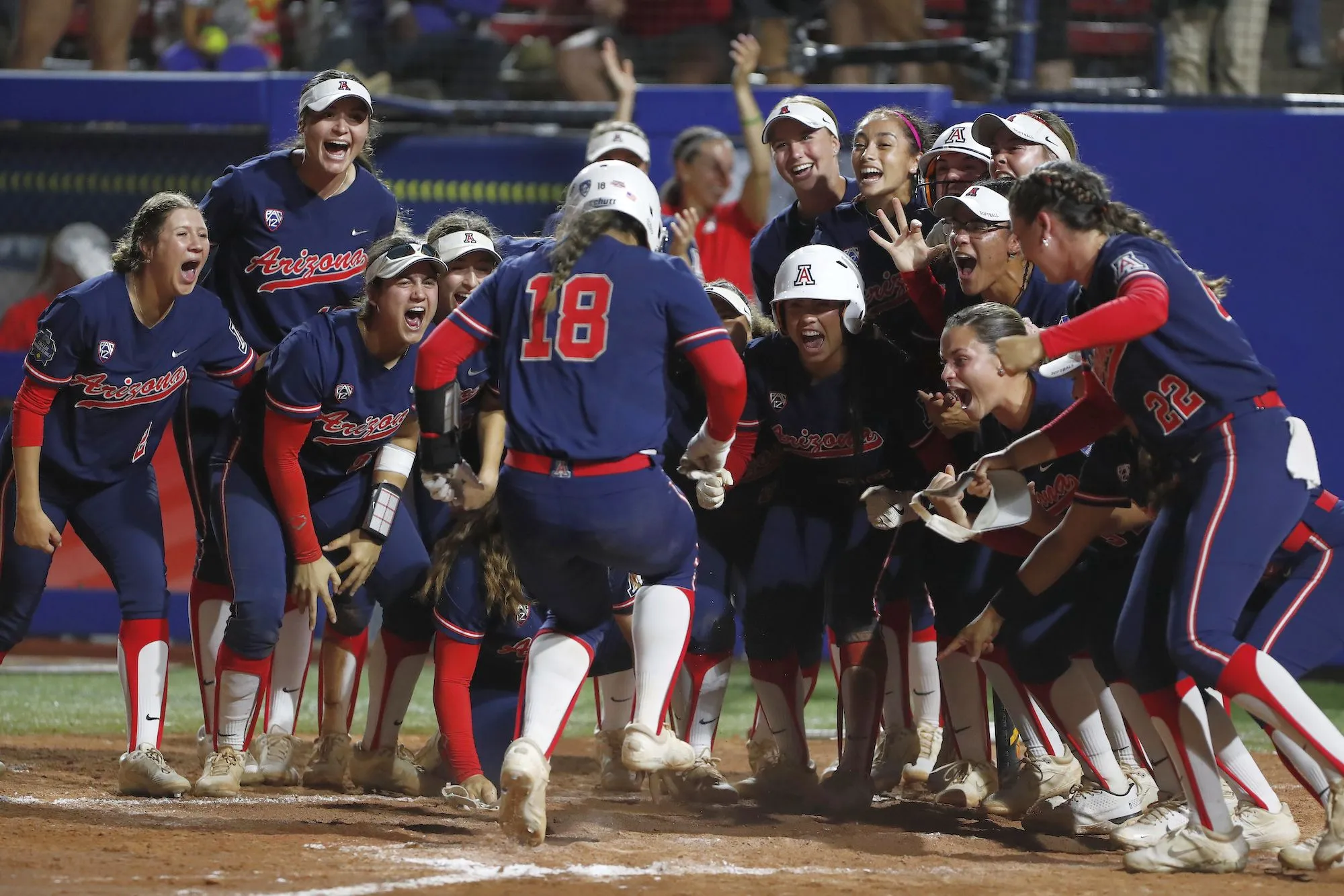 Arizona catcher Sharlize Palacios (18) is met at home plate after a home run against Oklahoma State during the fifth inning of an NCAA softball Women's College World Series game Thursday, June 2, 2022, in Oklahoma City. (Photo by Alonzo Adams/AP Photo)