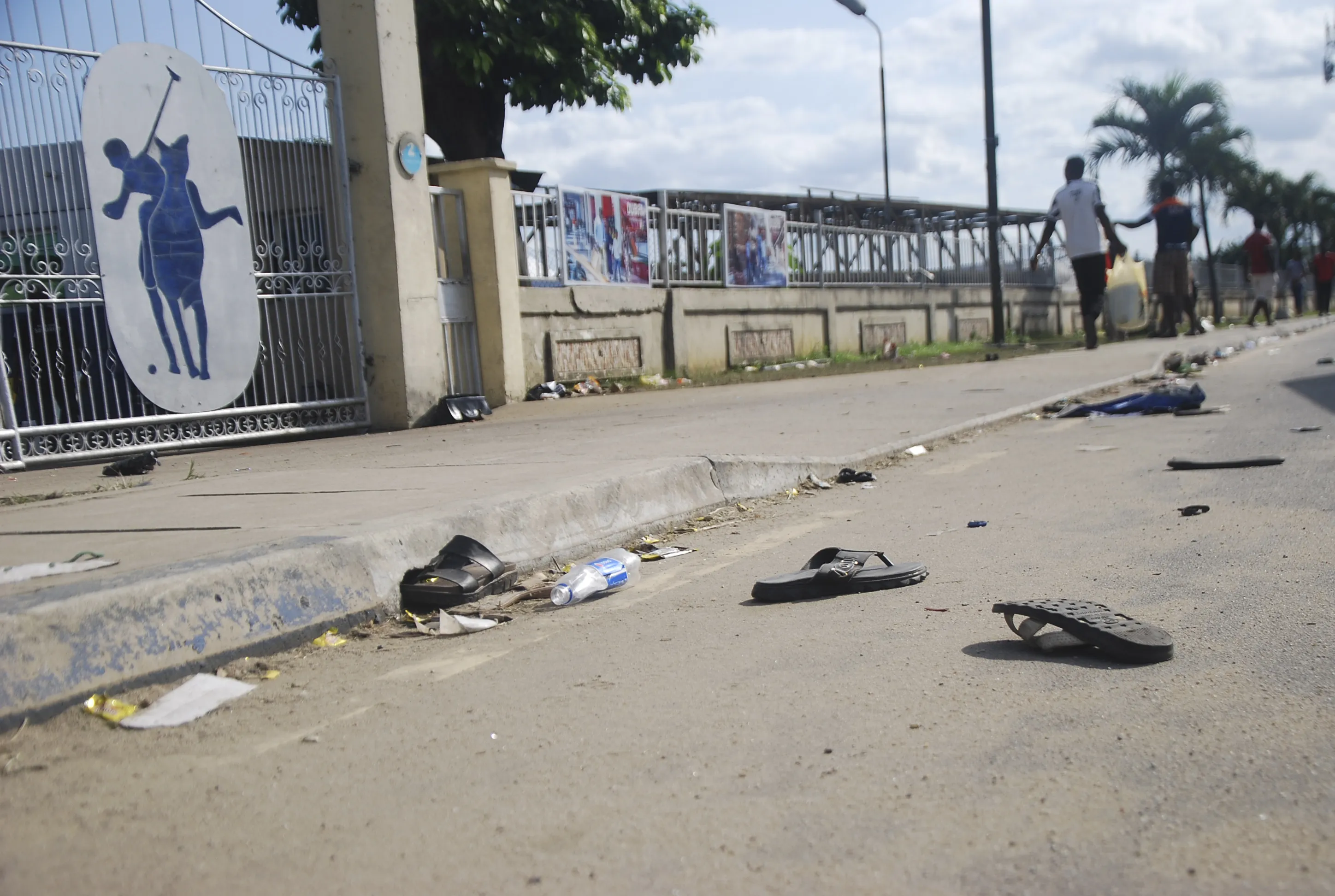 A view of flip fops and sandals on the street, following a stampede in Port Harcourt, Nigeria, Saturday, May 28, 2022. Police say a stampede at a church charity event in southern Nigeria has left at least 31 people dead and seven injured. One witness said the dead included a pregnant woman and “many children”. Police said the stampede took place at an annual “Shop for Free” program organized by the Kings Assembly Pentecostal church in Rivers state. Such events are common in Nigeria, (Photo by AP Photo/Stringer)