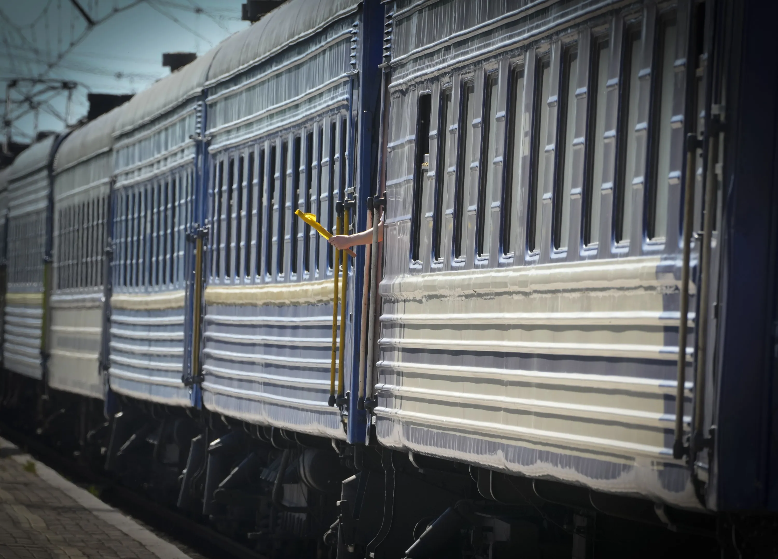 A railway worker gives a sign for departure of an evacuation train, whose passengers were evacuated from the war-hit area, in Pokrovsk, eastern Ukraine, Saturday , June 11, 2022. (Photo by Efrem Lukatsky/AP Photo)
