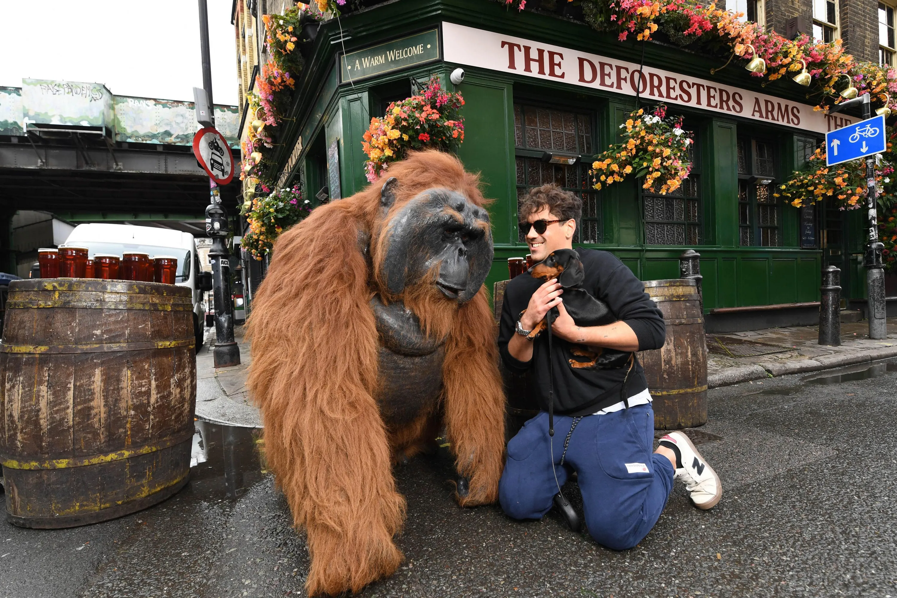 Pongo, an animatronic orangutan, Louis and his dog, named Apache, outside Meridian's pop-up jungle-themed pub, The Deforesters Arms, in London on October 5, 2021, which is raising money for International Animal Rescue, a charity seeking to preserve and protect Orangutan habitats. (Photo by Doug Peters/PA Wire Press Association)