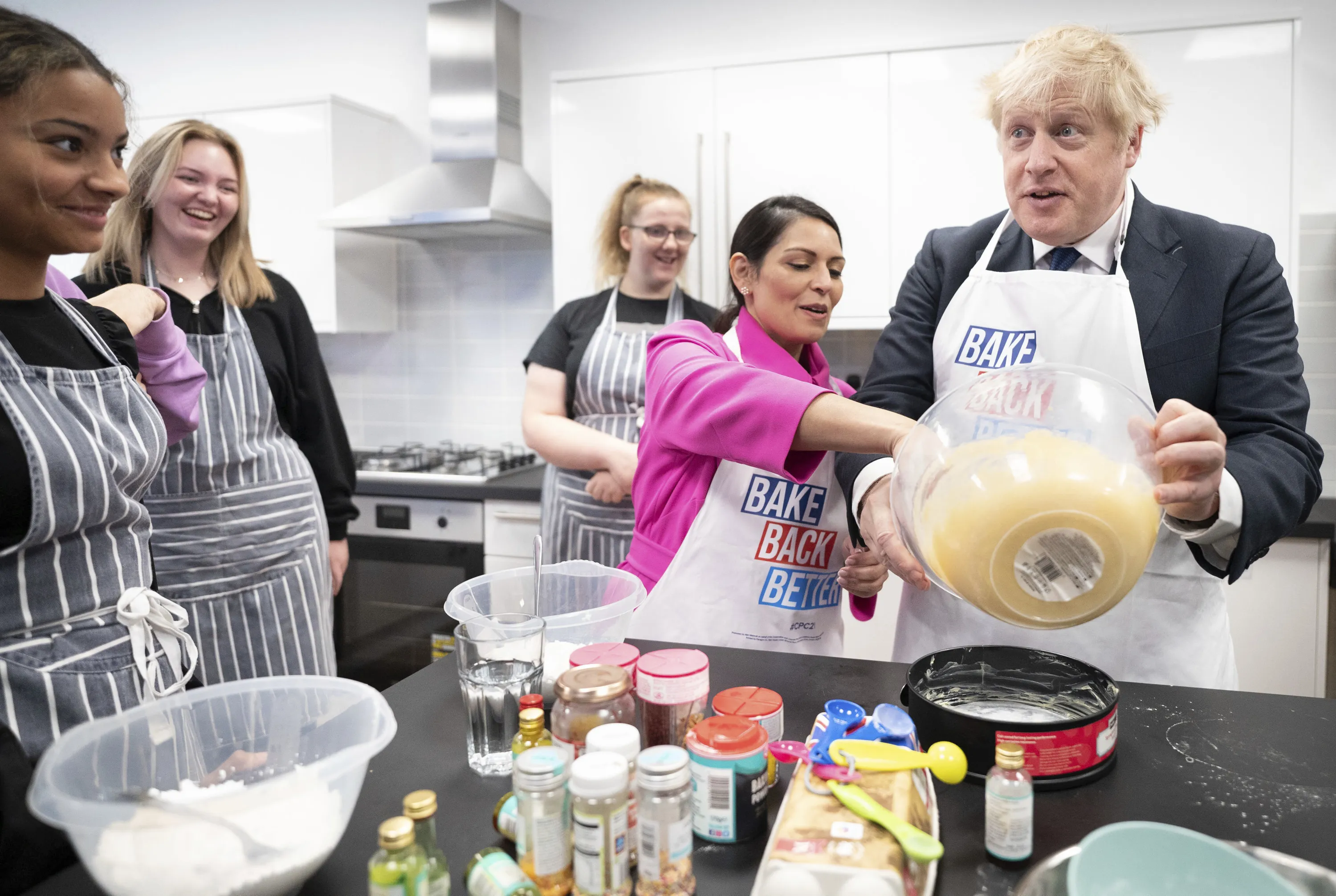 Home Secretary Priti Patel looks on as Prime Minister Boris Johnson tries his hand at baking during a visit to the HideOut Youth Zone, in Manchester on Sunday, October 3, 2021. (Photo by Stefan Rousseau/AP Photo)